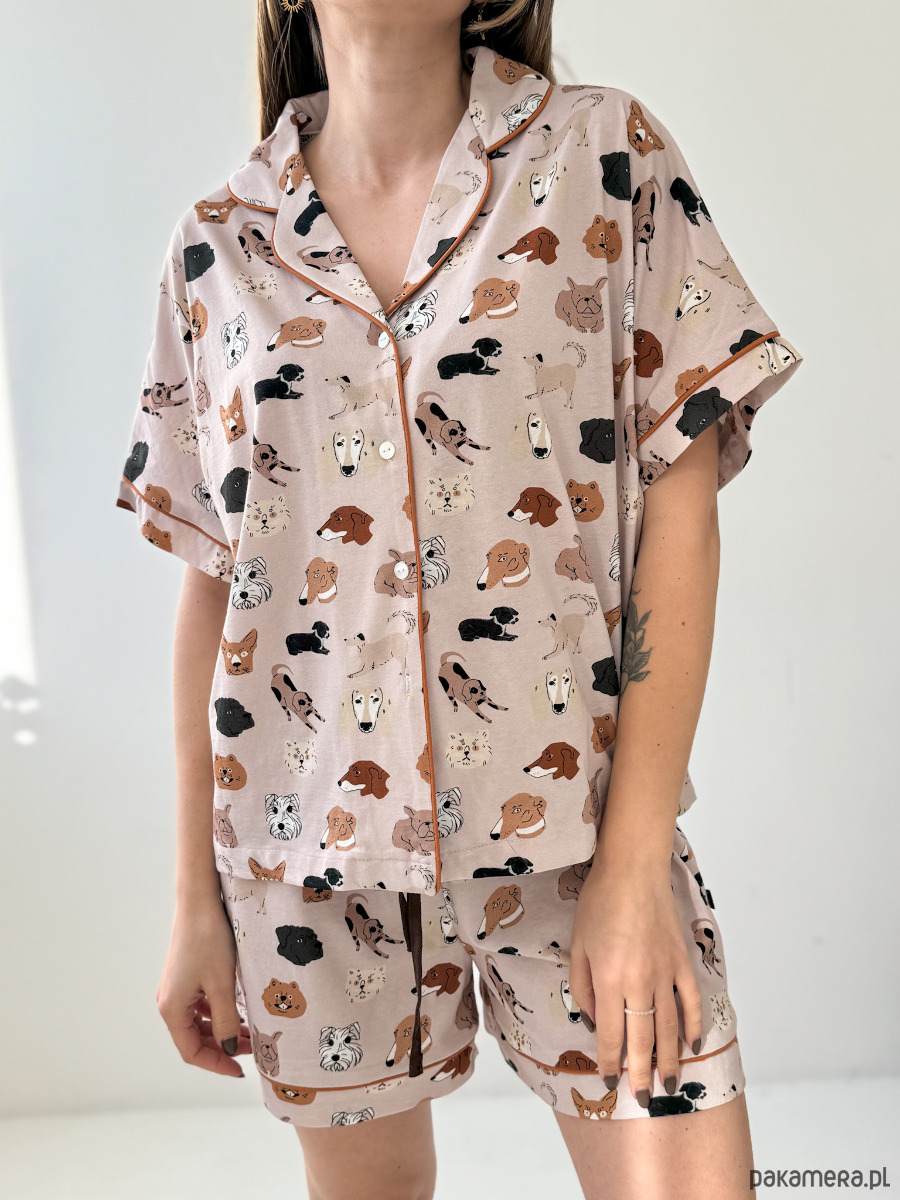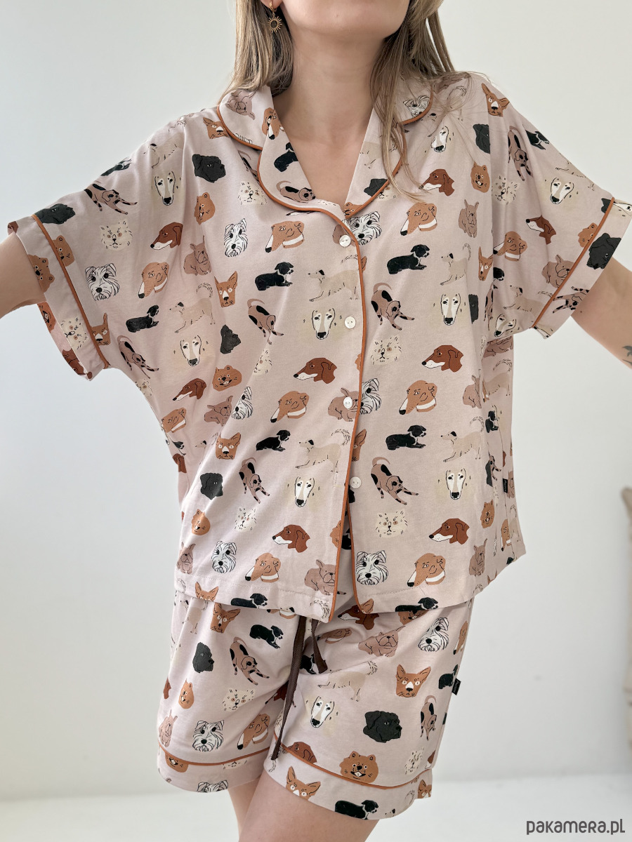 Idealna piżama dla psiej mamy! Koszula bawełniana i luźne szorty na gumce od piżamy pieski wykonana z lekkiej, cieńszej dzianiny bawełnianej w nasz cudowny nadruk! Stwórz idealny zestaw do snu lub domowego odpoczynku. Zapinana na guziki koszula z płaskim kołnierzem ma luźny oversizowy krój. Elegancji dodają jej wykończenia w postaci kontrastujących wypustek przy kołnierzu i makietach.