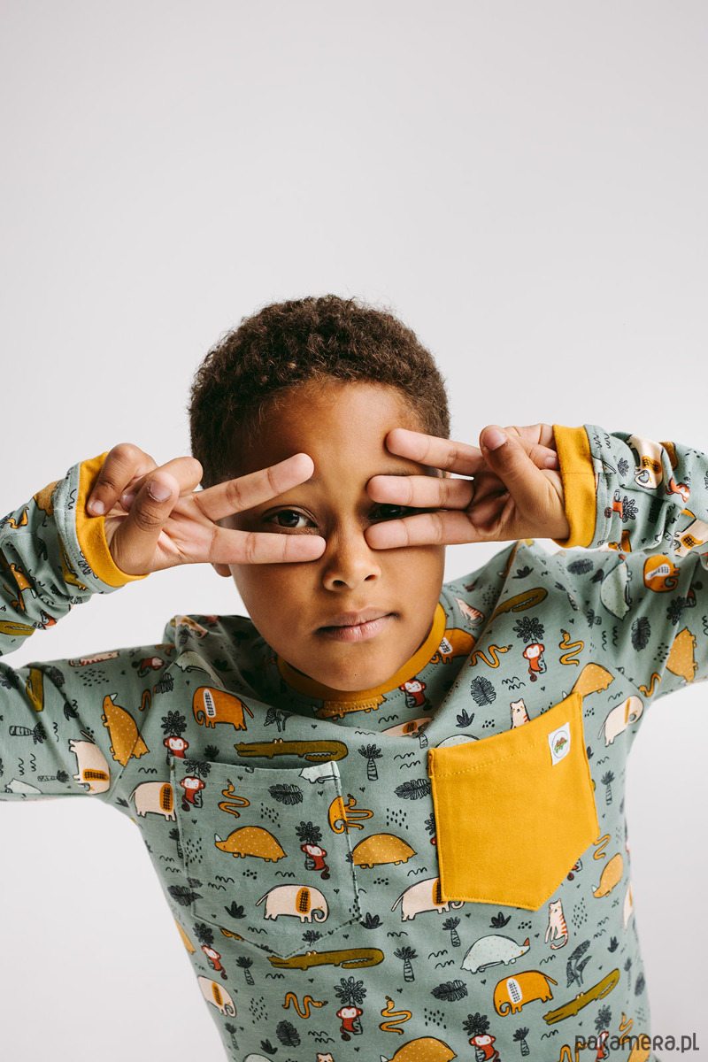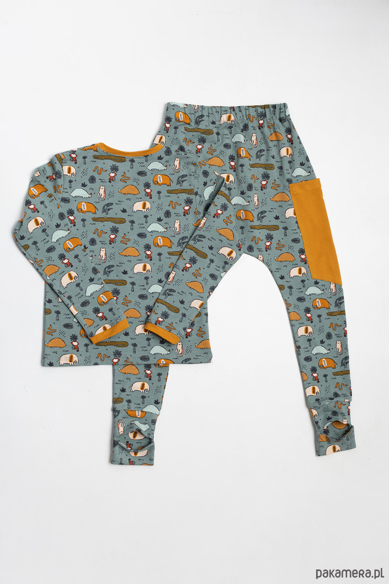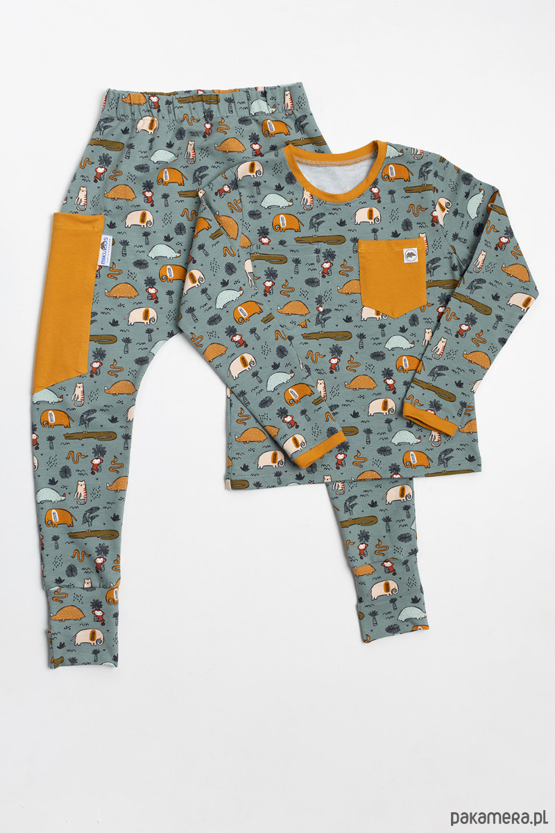 Krokodyle, węże, małpy i słonie. Co jeszcze możesz dostrzec na dzikim Safari? Ten dwuczęściowy zestaw złożony z wygodnych, długich spodni z obniżonym krokiem i bluzki aż z dwiema kieszonkami. Wygodna i pojemna kieszeń na nogawce spodni.