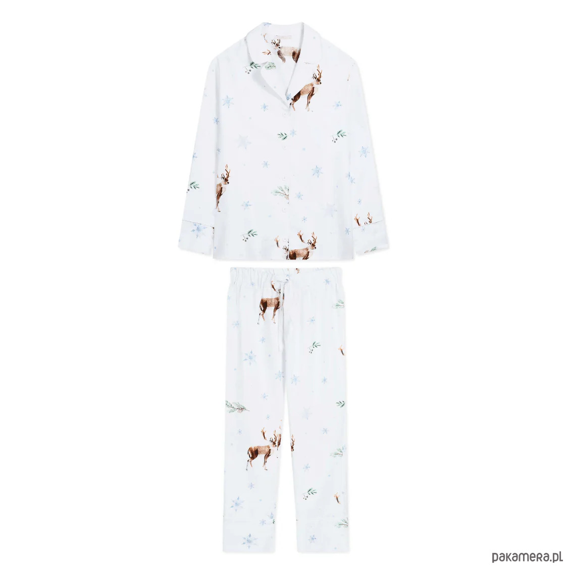 Przepiękna i wygodna piżama damska na zimę. Koszula z długim rękawem zapinana na guziki oraz długie spodnie na gumce z dodatkowym wiązaniem. Cała piżama uszyta z bawełny i wykończona ozdobną lamówką. Materiał jest przewiewny, miękki i jedwabny w dotyku, co sprawia, że śpi się w niej bardzo komfortowo. Nadruk w postaci reniferów i płatków śniegu pozwala poczuć zimowo-świąteczny klimat.