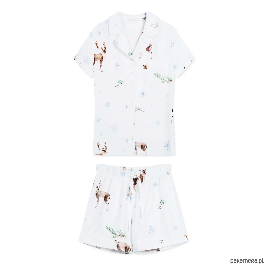 Zima to Twoja ulubiona pora roku, a na święta zawsze czekasz z niecierpliwością? Piżama Renifery to wybór dla Ciebie! Utrzymana w chłodnej zimowej kolorystyce, z nadrukowanymi reniferami i płatkami śniegu. Wzór jest naszego autorstwa i został naniesiony przy użyciu nietoksycznych, antyalergicznych i bezzapachowych tuszy wodnych. Nadruk nie farbuje i nie spiera się, nawet po wielu praniach. Komplet składa się z koszuli z krótkim rękawem, zapianej na guziki oraz