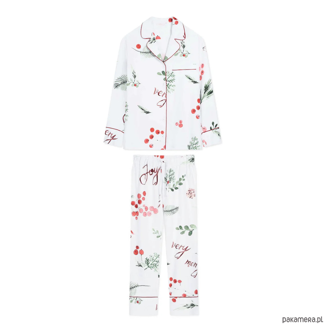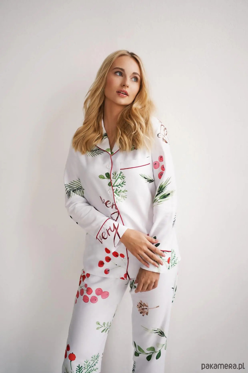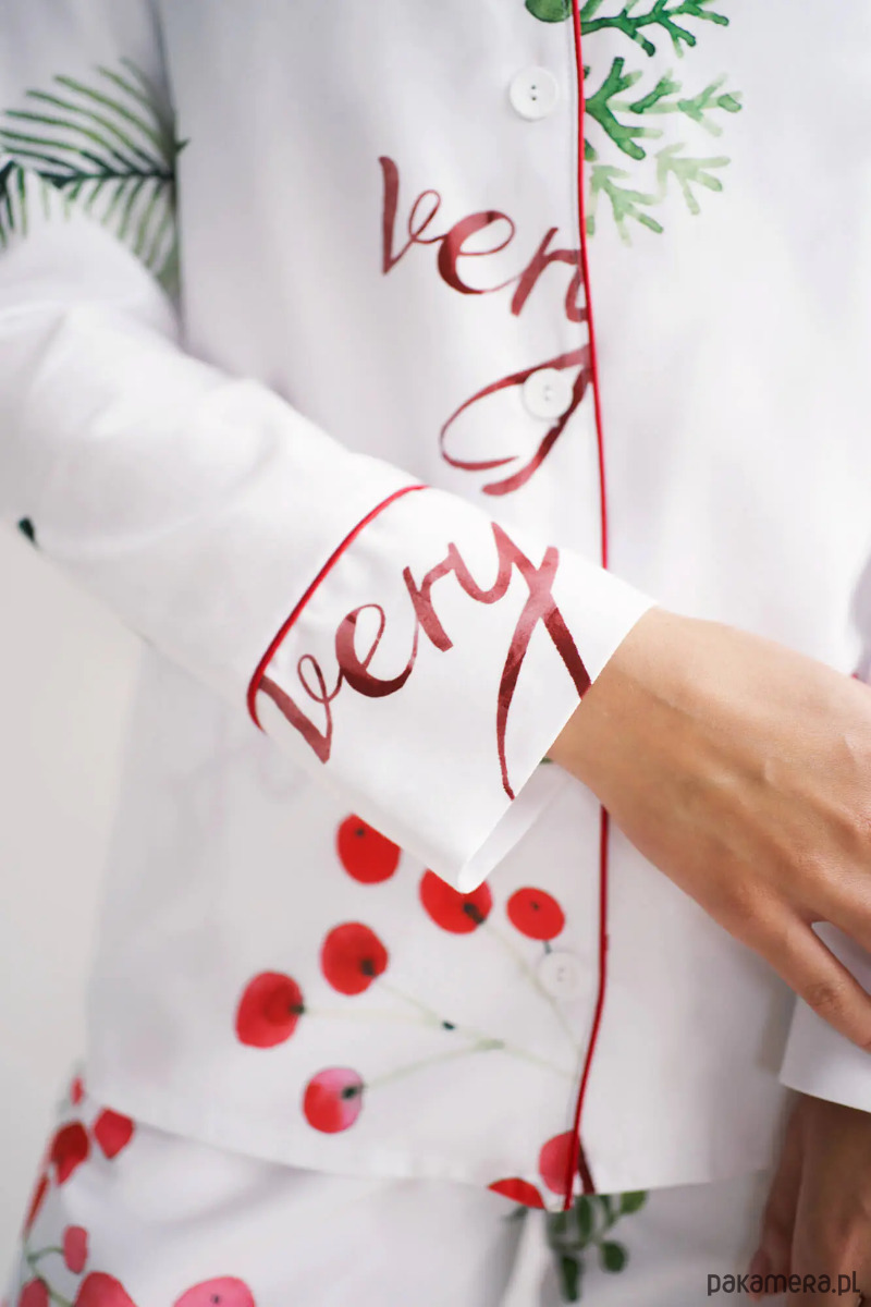 Przepiękna i wygodna piżama świąteczna. Poznaj naszą propozycję na dopełnienie świątecznego klimatu - piżama damska Very Merry. W komplecie znajduje się koszula z długim rękawem zapinana na guziki oraz długie spodnie na gumce, z dodatkową możliwością wiązania.