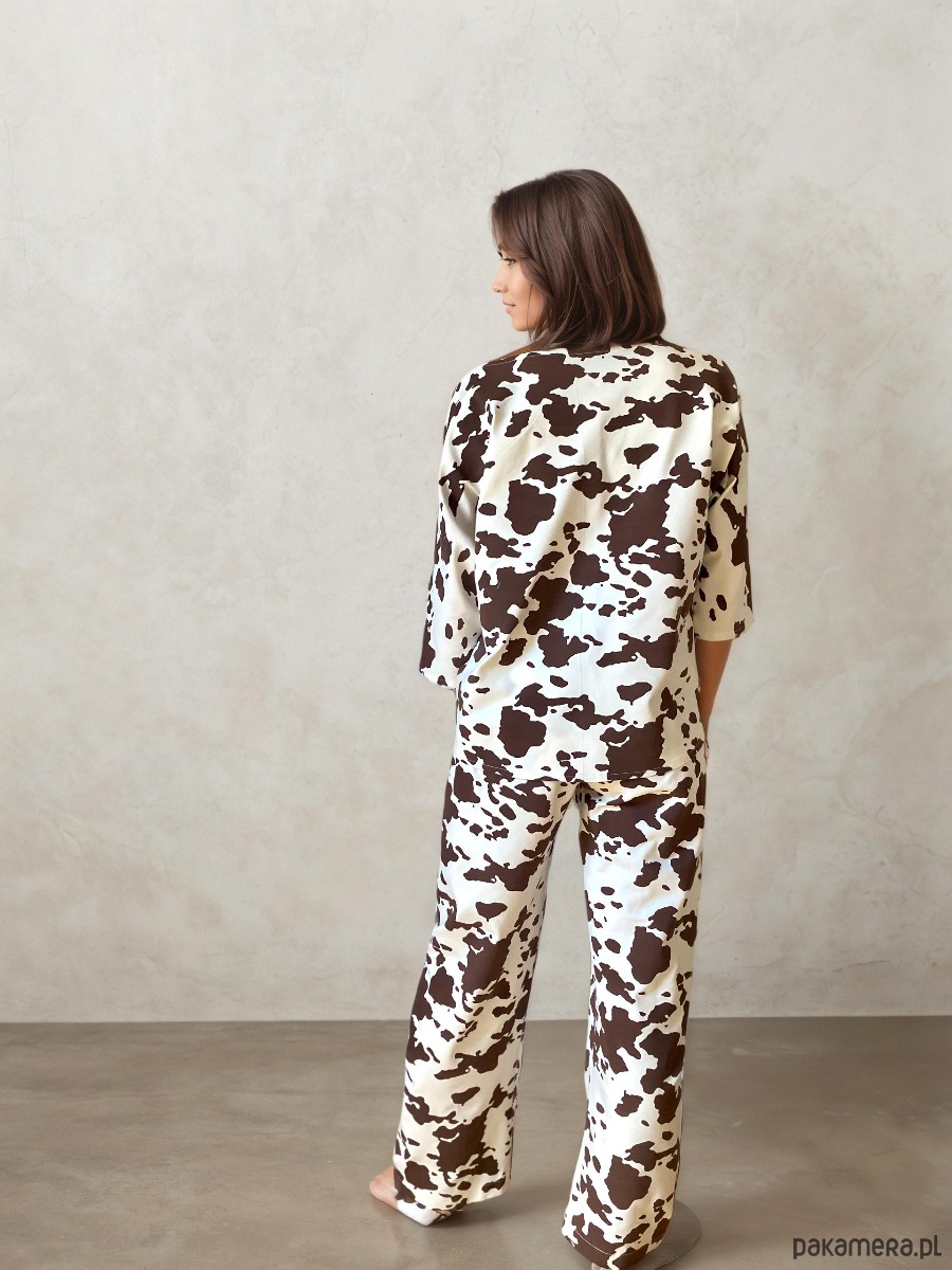 Piżamka składa się ze spodni oraz klasycznej koszuli na piękne z masy perłowej guziki.