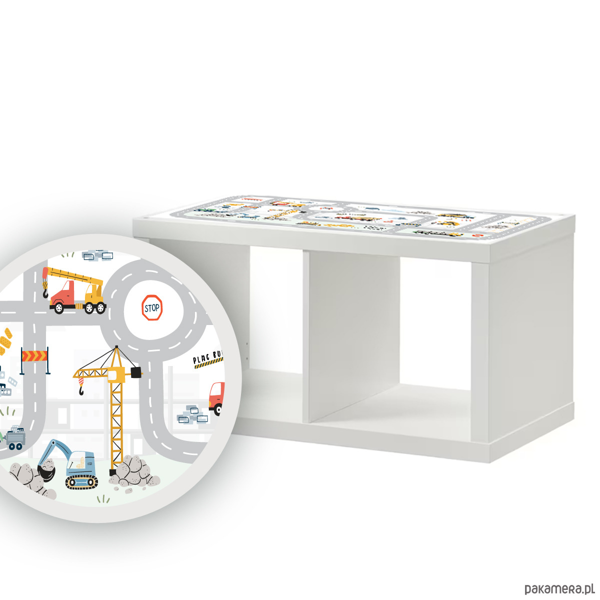 Odmień wygląd regału na zabawki! Naklejka z motywem placu budowy została zaprojektowana z myślą o małych fanach maszyn.