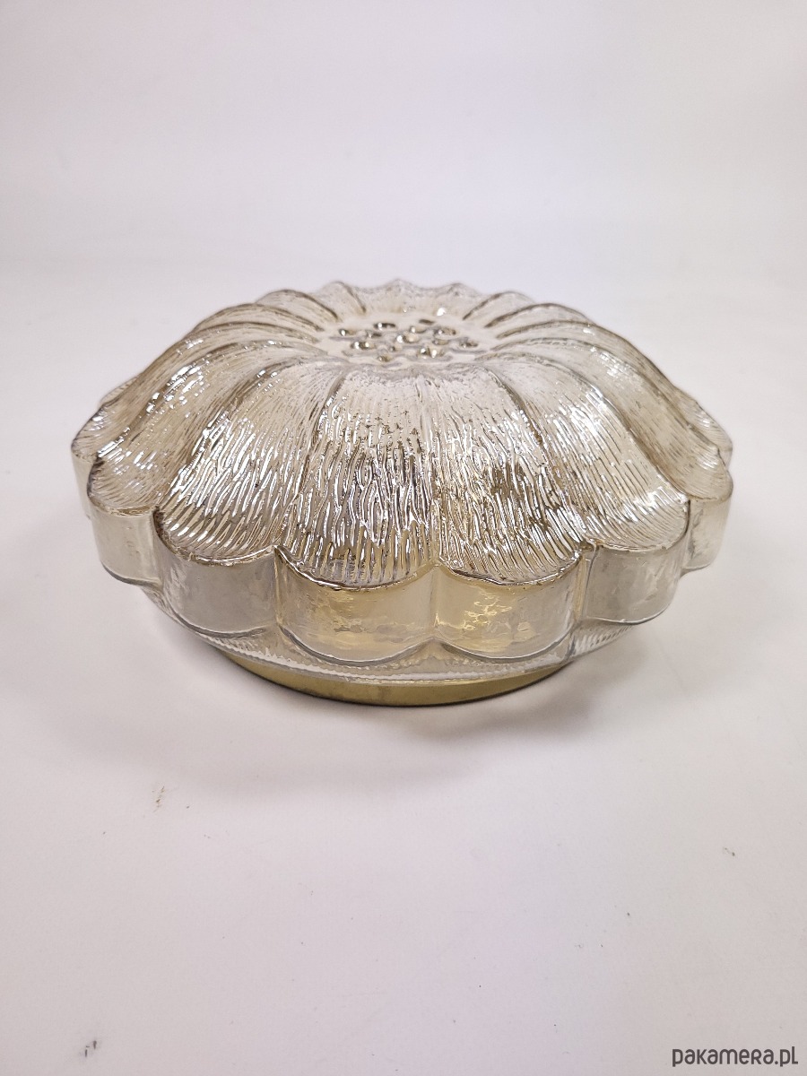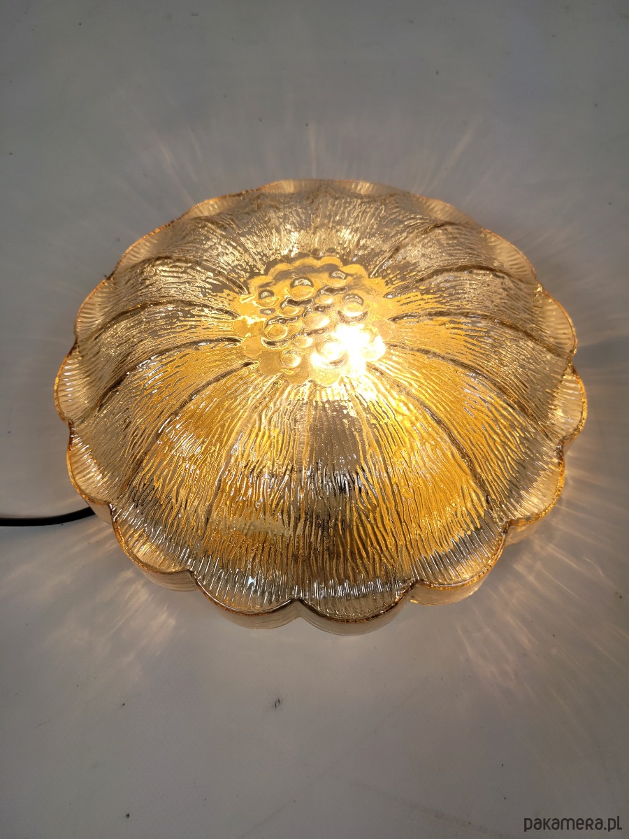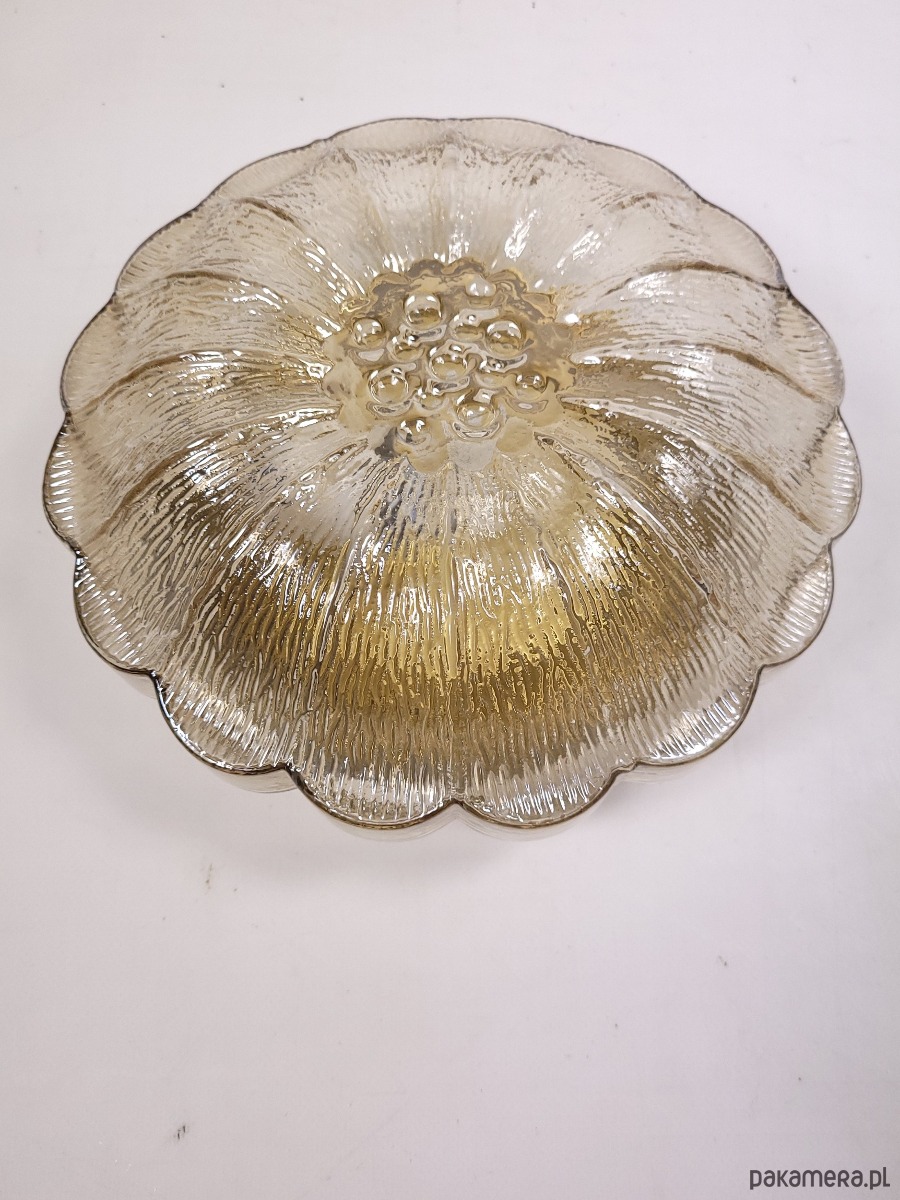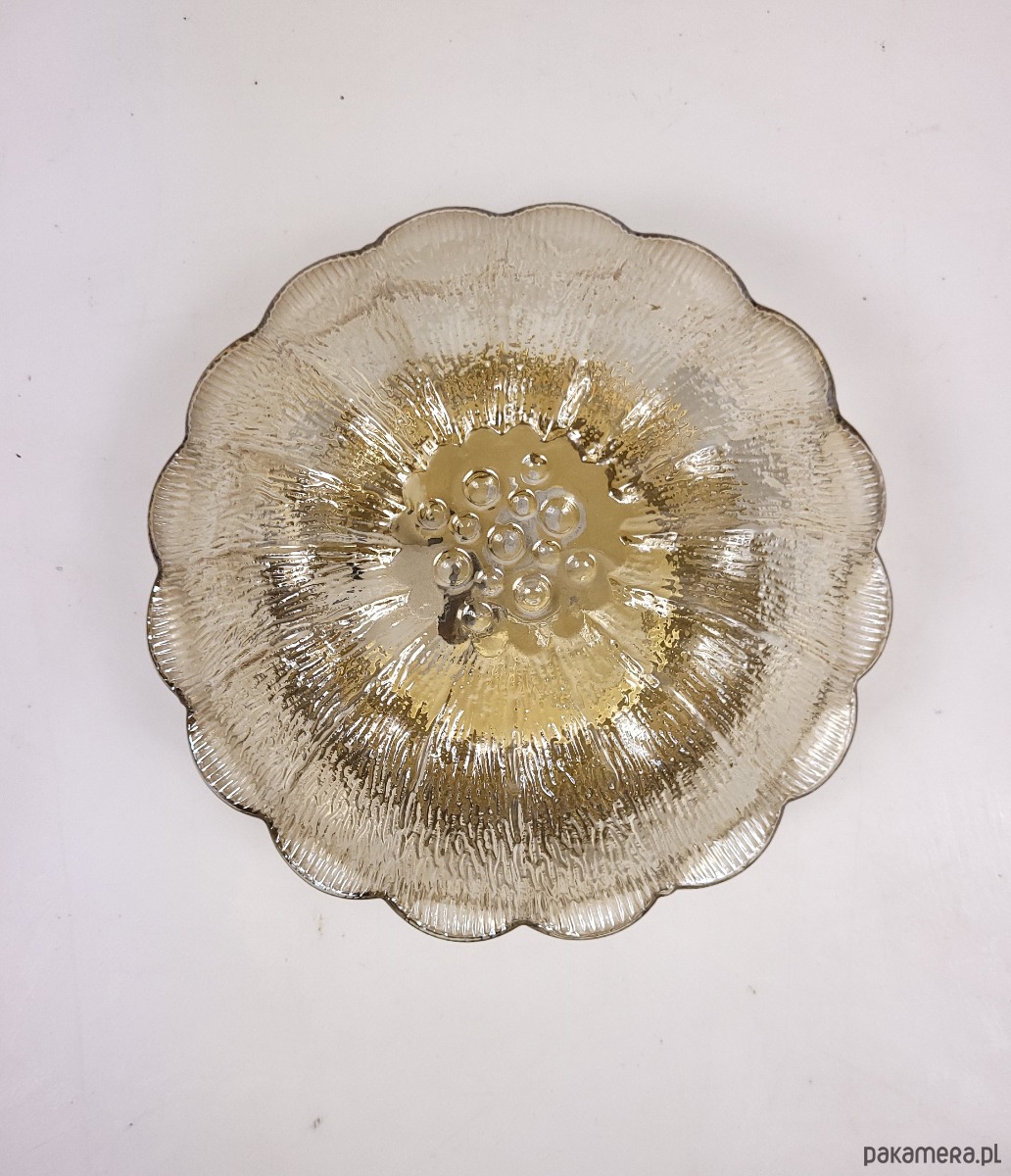 Plafon z lat 70 w formie kwiatka z dymionego. Lampa w stanie dobrym od spodu posiada kilka zarysowań na części metalowej.