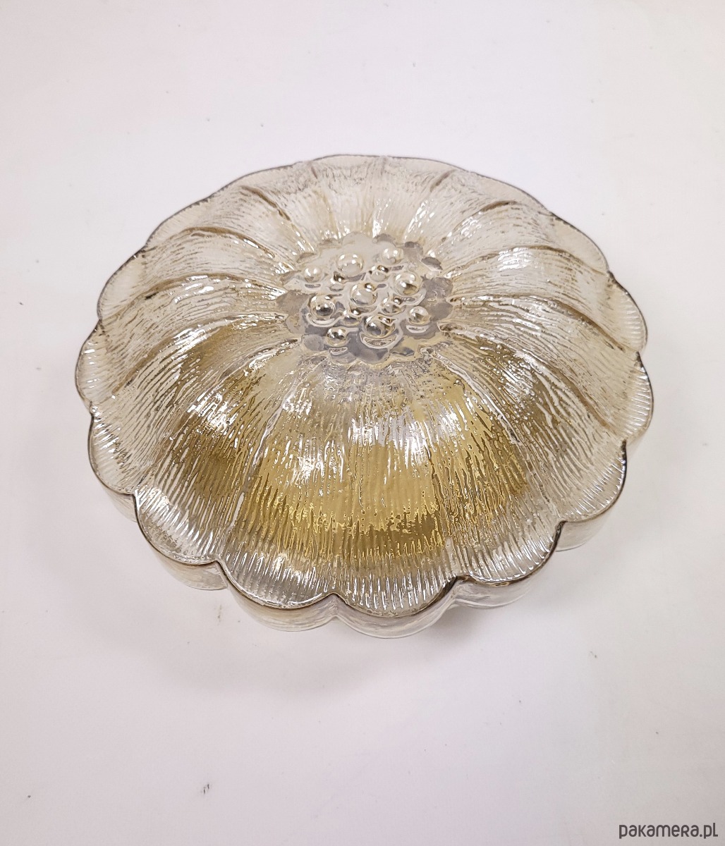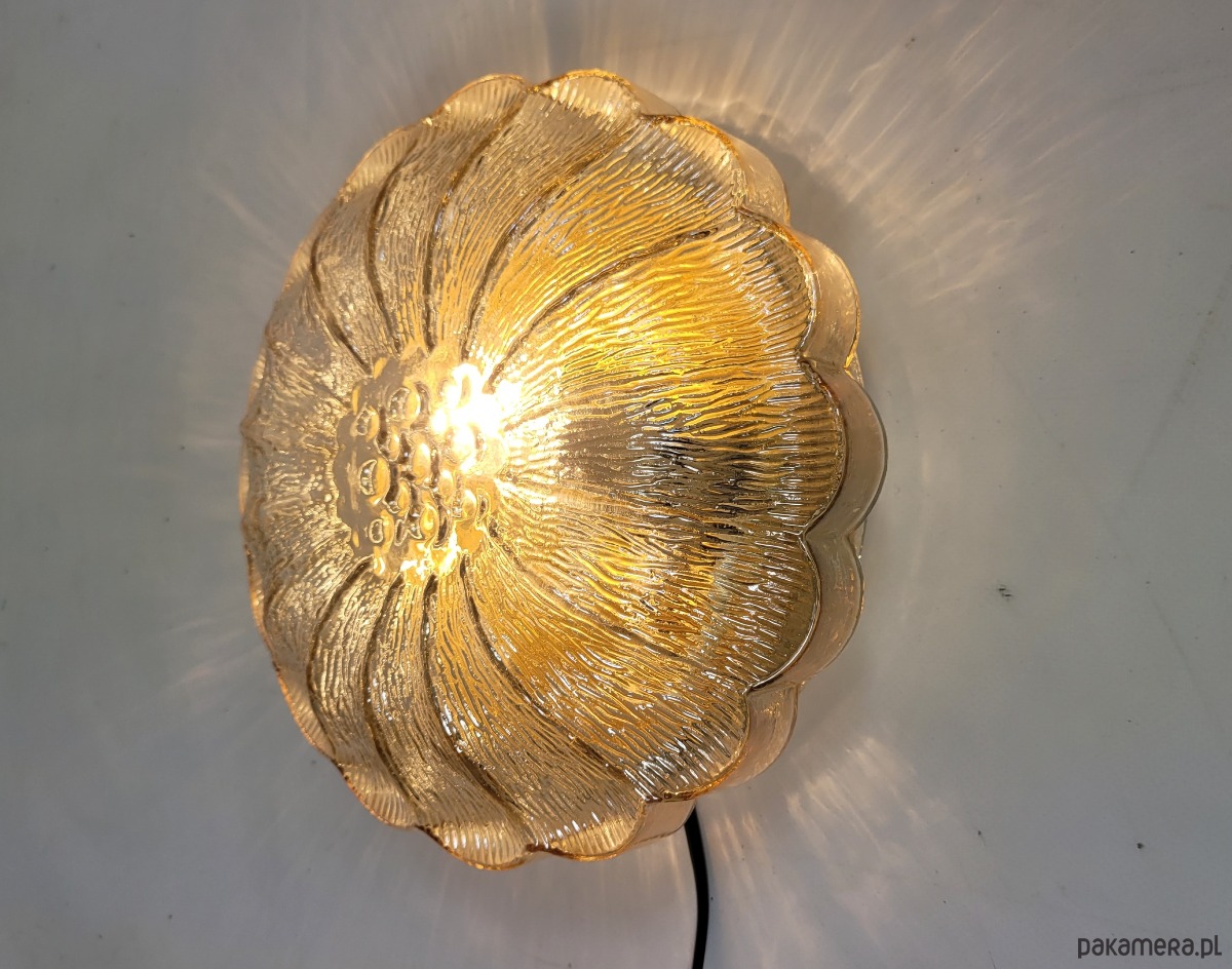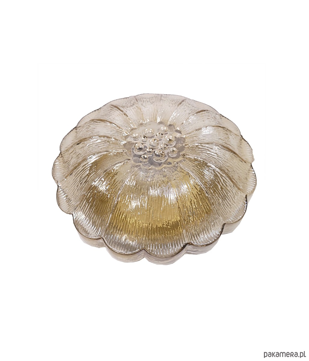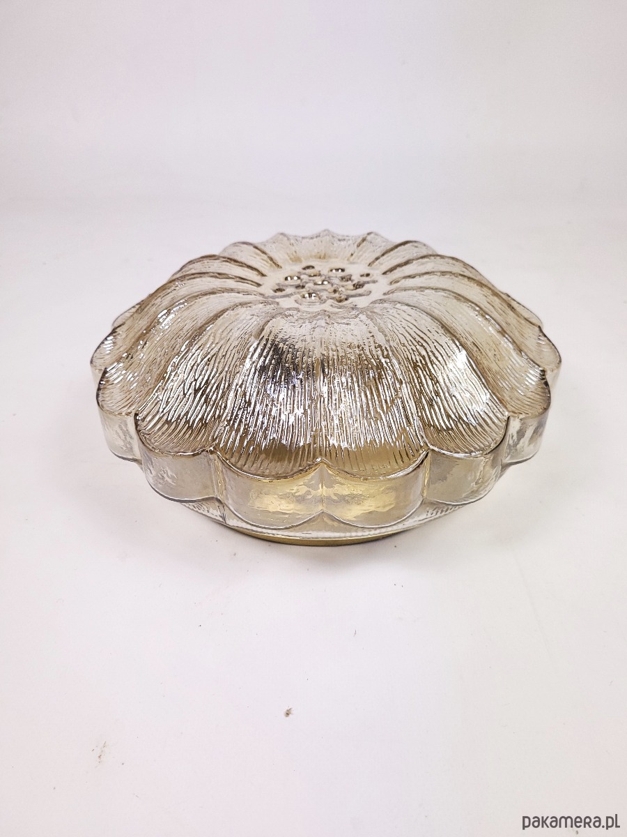 Plafon z lat 70 w formie kwiatka z dymionego. Lampa w stanie dobrym od spodu posiada kilka zarysowań na części metalowej.