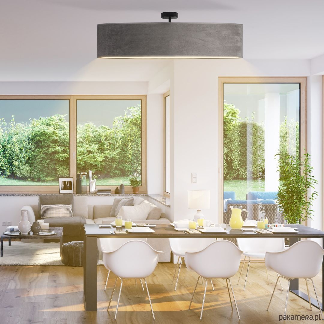 Lampa GRENADA VELUR fi - 100 cm posiada szeroki, cylindryczny klosz wykonany z teksturowanej tkaniny, która nadaje jej elegancki i nowoczesny wygląd. Montaż na suficie jest prosty, a minimalistyczny uchwyt sprawia, że lampa doskonale komponuje się z różnymi stylami wnętrz. Dostępna jest w kilku wariantach kolorystycznych, co pozwala na dopasowanie do indywidualnych preferencji i charakteru pomieszczenia. Klosze są starannie wykonane, co gwarantuje trwałość i estetyczny wygląd na długie lata.