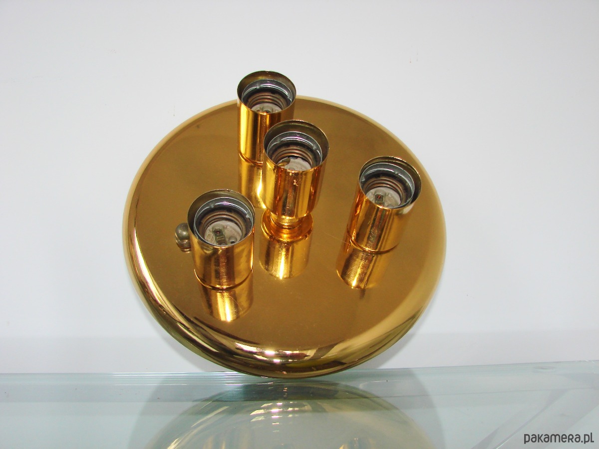 Oryginalny plafon sufitowy z lat 80., wykonany z metalu wykończonego w kolorze mosiądzu. Lampa posiada elegancką, prostą formę charakterystyczną dla oświetlenia z tego okresu, dzięki czemu doskonale sprawdzi się zarówno we wnętrzach vintage, jak i w aranżacjach retro, mid-century czy modern classic.