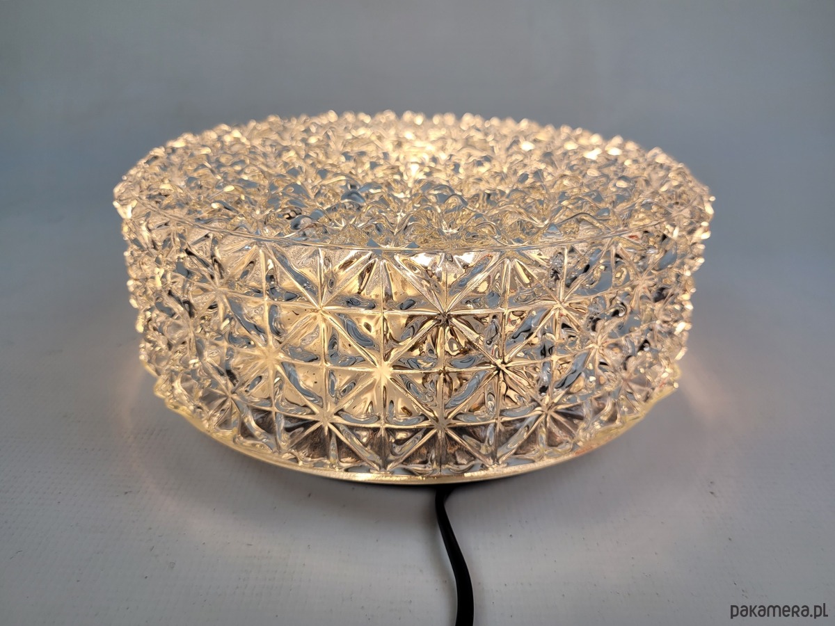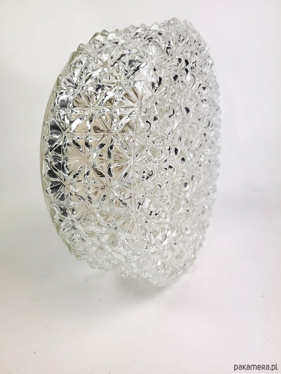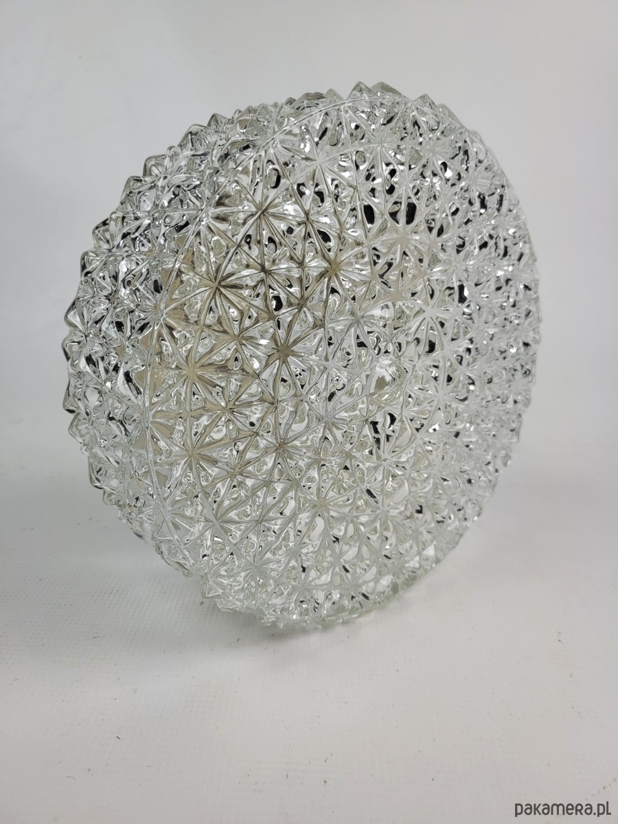 Prezentujemy niezwykle efektowny plafon sufitowy, który jest kwintesencją europejskiego designu lat sześćdziesiątych i siedemdziesiątych. Ta wyjątkowa lampa łączy w sobie surowość modernizmu z dekoracyjnym charakterem szkła kryształowego, tworząc przedmiot, który po włączeniu całkowicie odmienia atmosferę wnętrza.Głównym elementem oprawy jest masywny klosz wykonany z grubego, transparentnego szkła o głębokiej, geometrycznej strukturze. Powierzchnia klosza została uformowana w powtarzalny wzór diamentowych faset, które działają niczym dziesiątki miniaturowych pryzmatów. Dzięki temu światło nie jest emitowane bezpośrednio, lecz ulega efektownemu rozproszeniu i załamaniu, malując na suficie i ścianach malownicze cienie oraz świetliste refleksy.