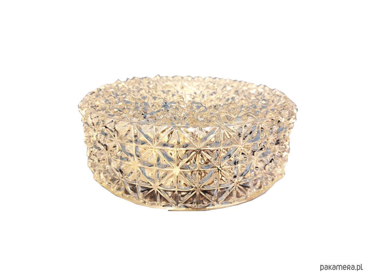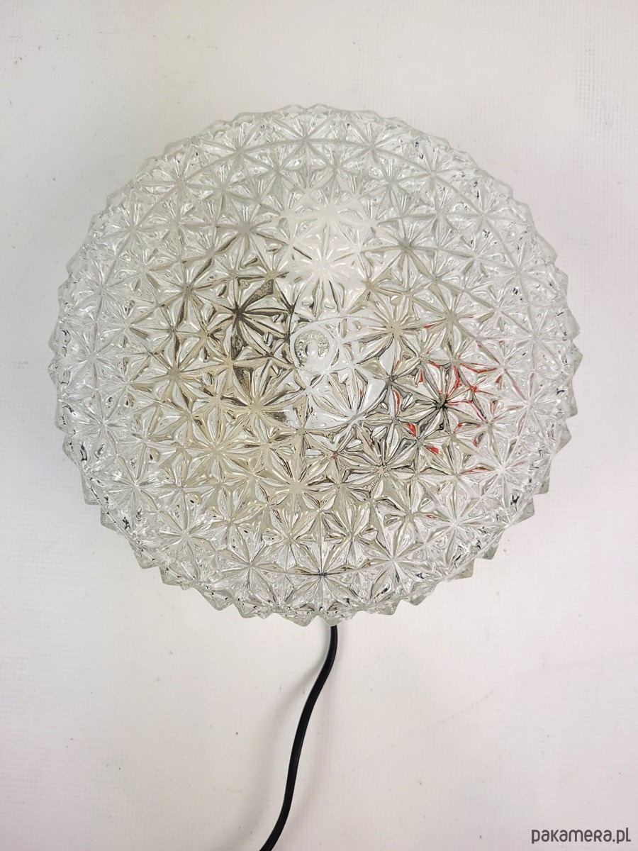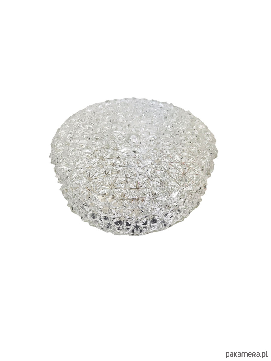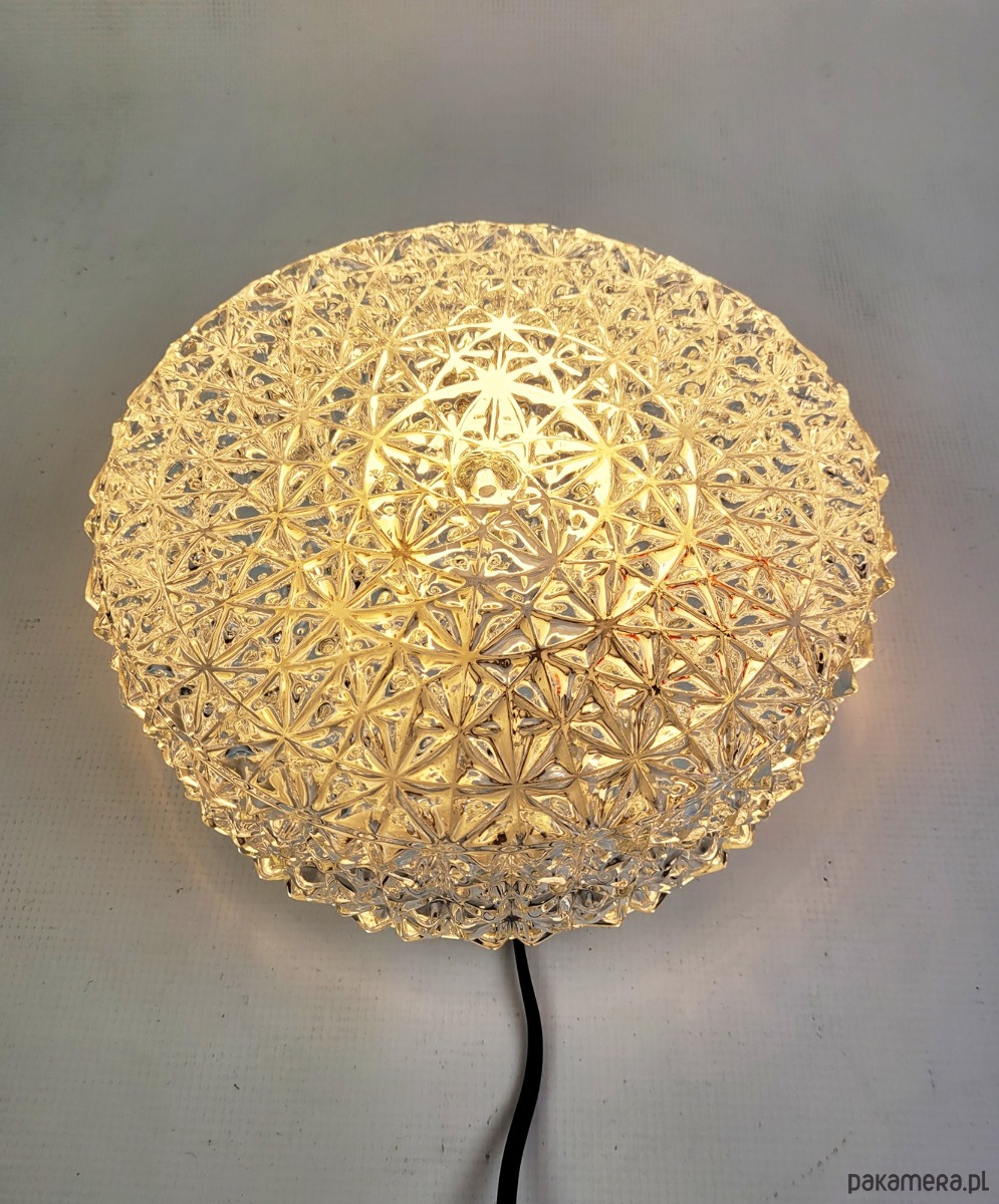 Prezentujemy niezwykle efektowny plafon sufitowy, który jest kwintesencją europejskiego designu lat sześćdziesiątych i siedemdziesiątych. Ta wyjątkowa lampa łączy w sobie surowość modernizmu z dekoracyjnym charakterem szkła kryształowego, tworząc przedmiot, który po włączeniu całkowicie odmienia atmosferę wnętrza.Głównym elementem oprawy jest masywny klosz wykonany z grubego, transparentnego szkła o głębokiej, geometrycznej strukturze. Powierzchnia klosza została uformowana w powtarzalny wzór diamentowych faset, które działają niczym dziesiątki miniaturowych pryzmatów. Dzięki temu światło nie jest emitowane bezpośrednio, lecz ulega efektownemu rozproszeniu i załamaniu, malując na suficie i ścianach malownicze cienie oraz świetliste refleksy.