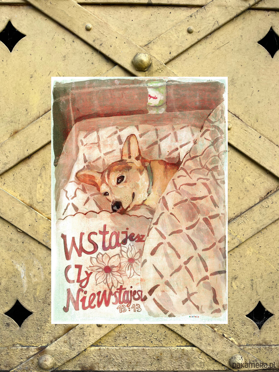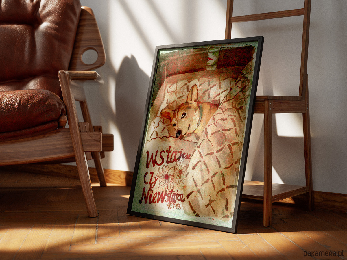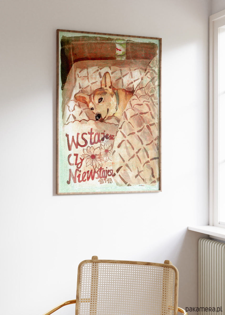 Plakat 13:13 wstajesz czy nie wstajesz pies łóżko spanko przyjaciel prezent