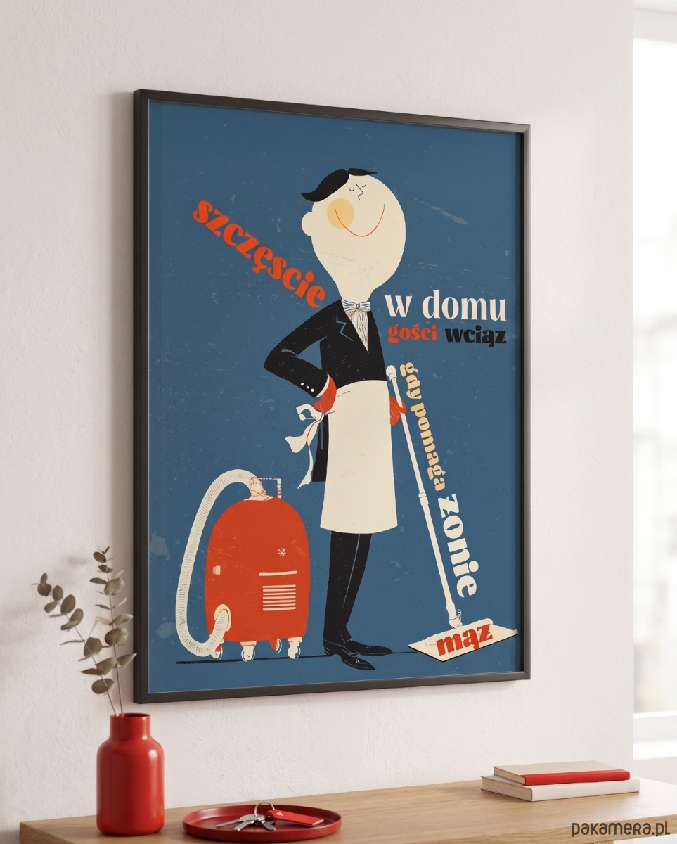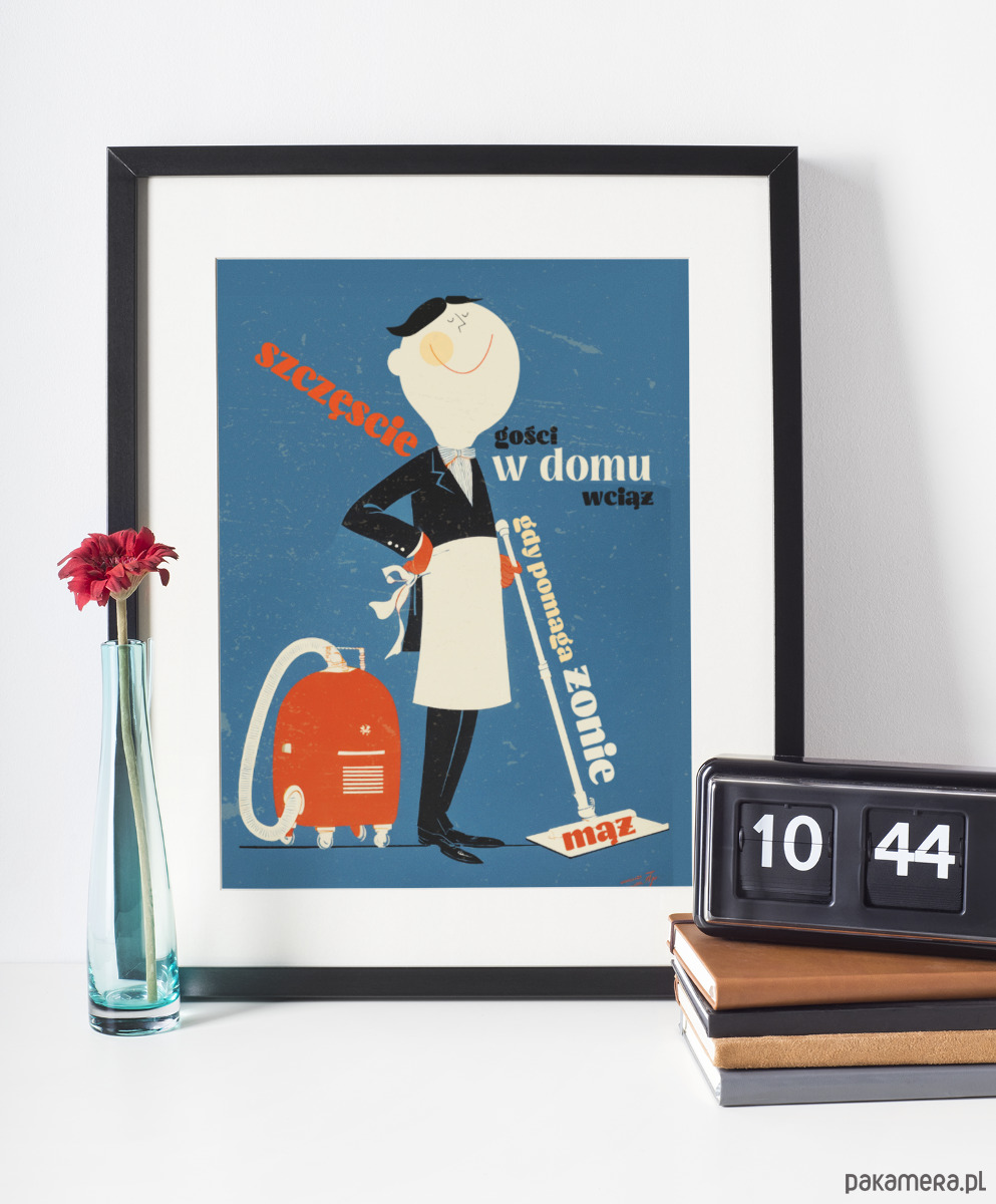 Przedstawia eleganckiego mężczyznę z odkurzaczem oraz hasło, polskie powiedzenie , „Szczęście gości w domu wciąż, gdy pomaga żonie mąż”