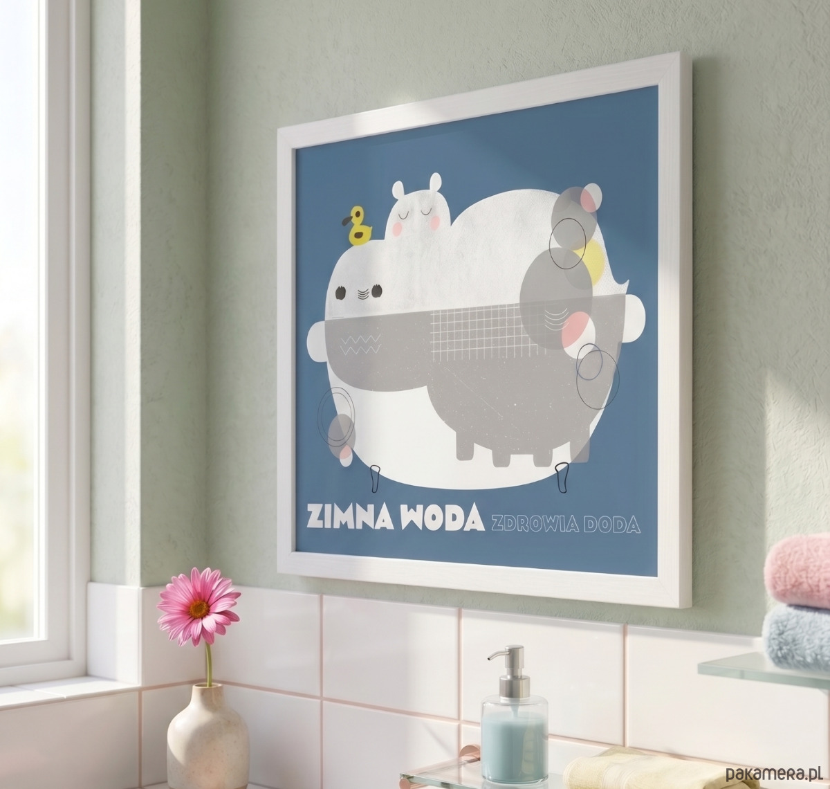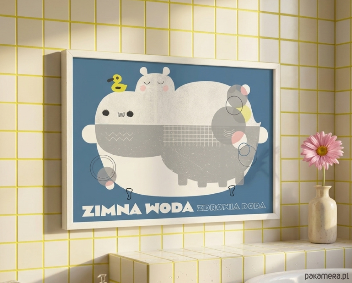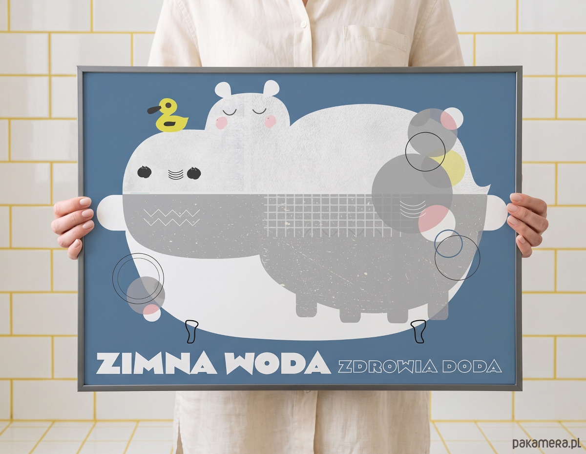 Grafika przedstawia hipopotama zażywającego ziemnej kąpieli . Hasło zimna woda zdrowia doda to zabawna wariacja na temat tradycyjnych prozdrowotnych powiedzeń. Plakat jest utrzymany w Twoim unikalnym stylu retro – z charakterystyczną fakturą, ograniczoną paletą barw i odważną, minimalistyczną formą nawiązującą do najlepszych lat polskiego designu.