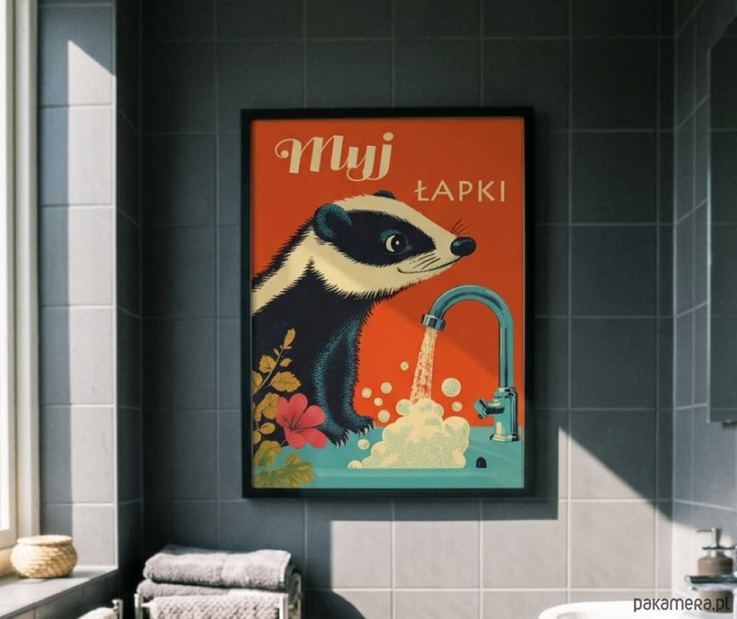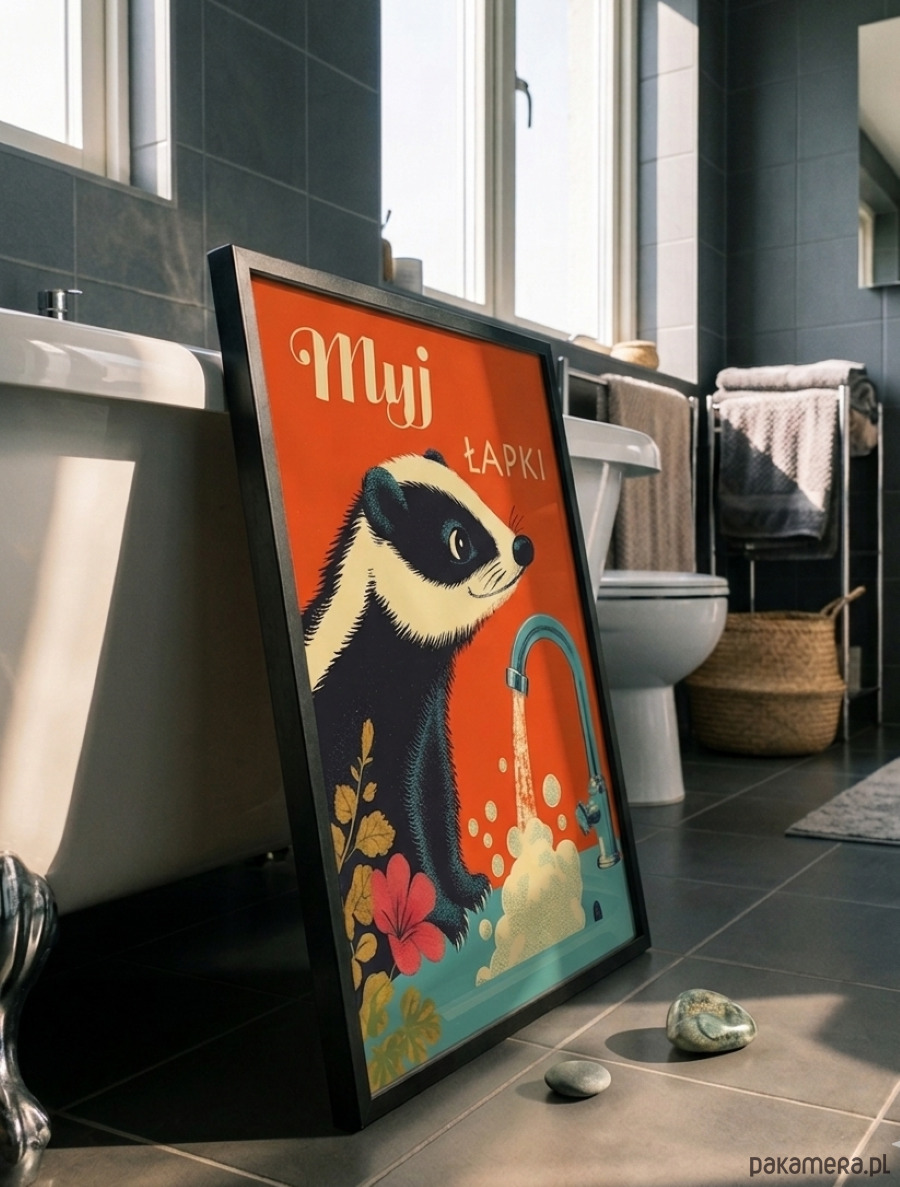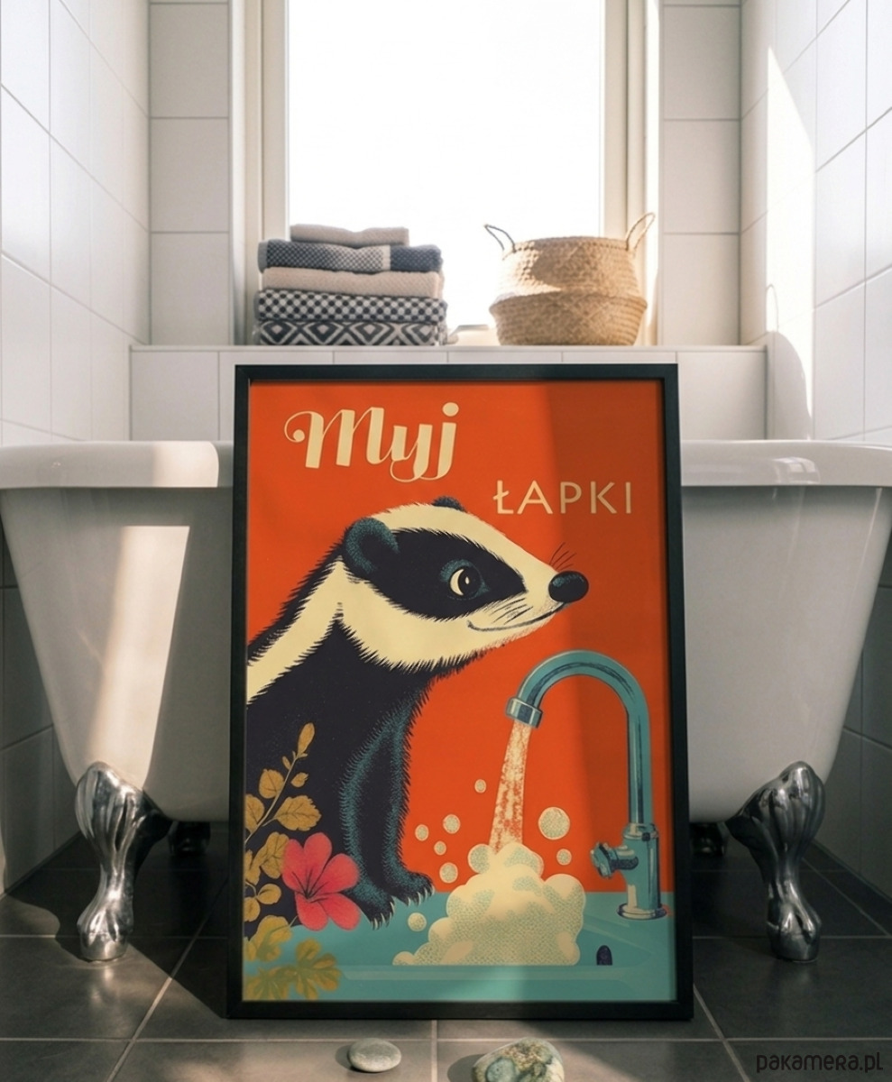 Ten uroczy plakat przedstawia uśmiechniętego skunksa, który z wielką starannością myje łapki w gęstej mydlanej pianie. To idealny, żartobliwy akcent do łazienki, który przypomina o higienie w sposób, obok którego nie da się przejść obojętnie. Grafika utrzymana jest w Twoim charakterystycznym stylu retro, z ciepłym tłem i teksturą vintage, co nadaje jej szlachetnego, kolekcjonerskiego wyglądu.