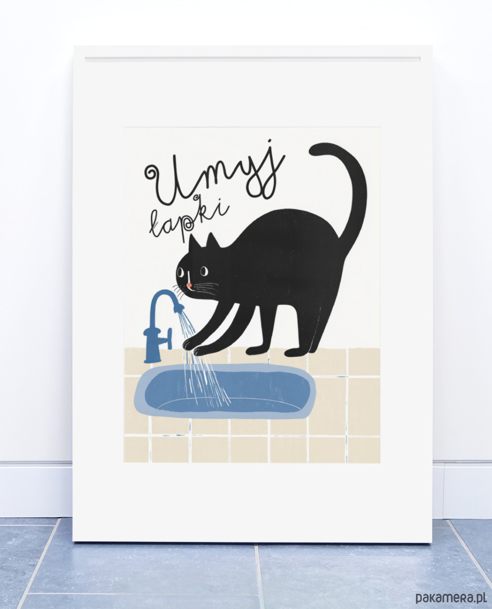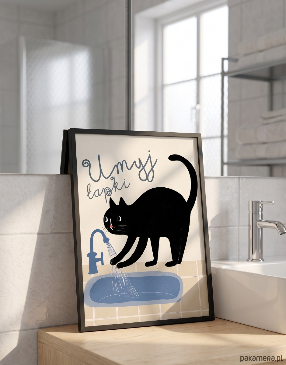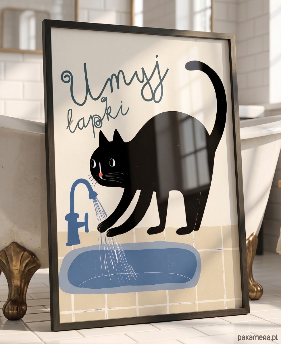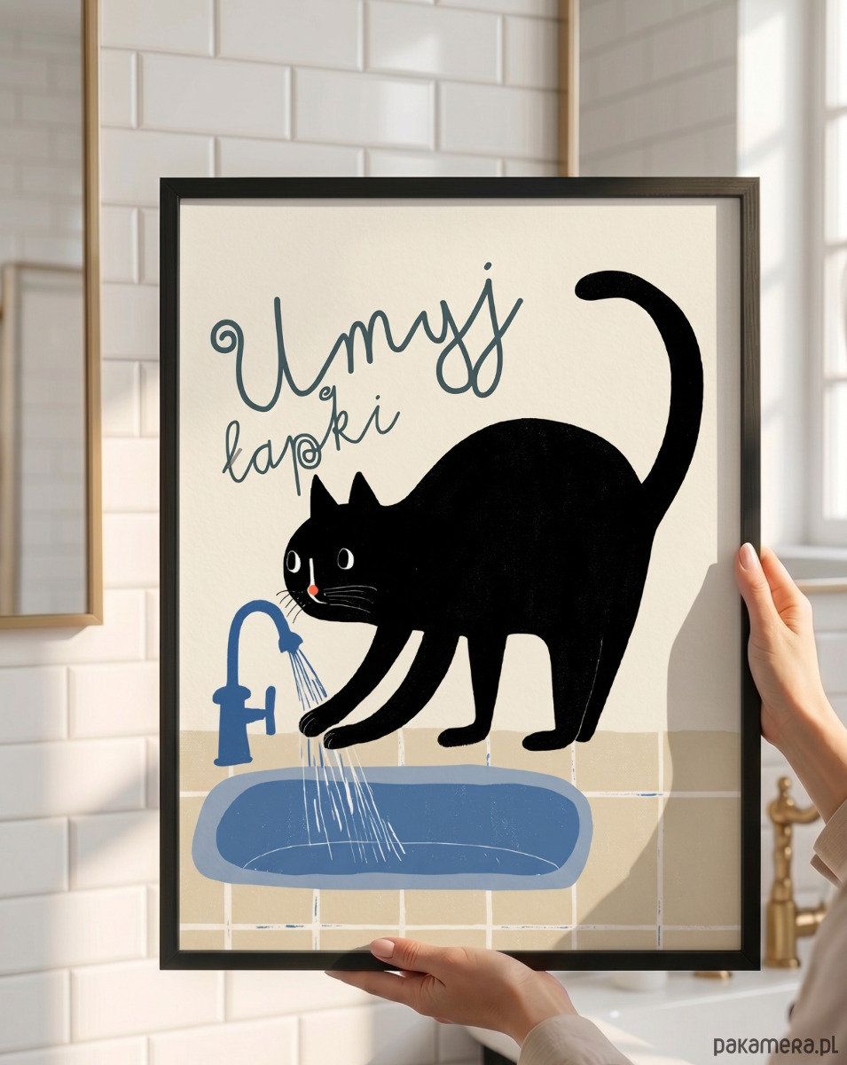 Wash Your Paws , umyj łapki – uroczy czarny kot do Łazienki | Plakat Retro dla Dzieci | Styl Mid-Century Modern | Dekoracja Łazienkowa