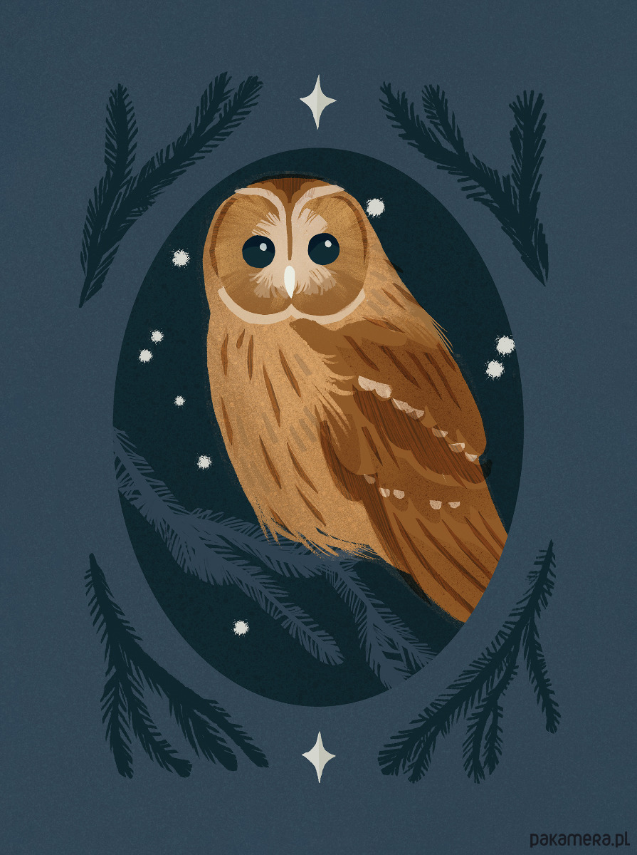 Puszczyk w zimowym, nieco tajemniczym i melancholijnym otoczeniu. Dla miłośników sów i spacerów o zmierzchu.