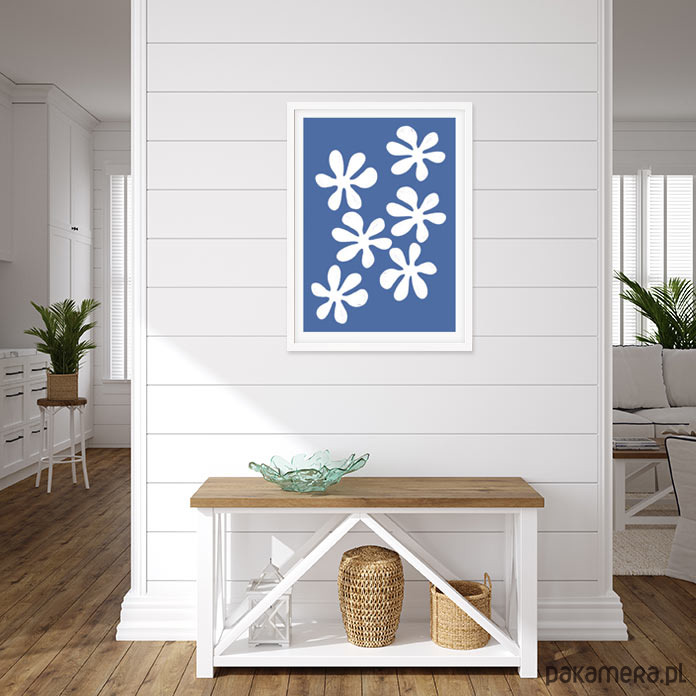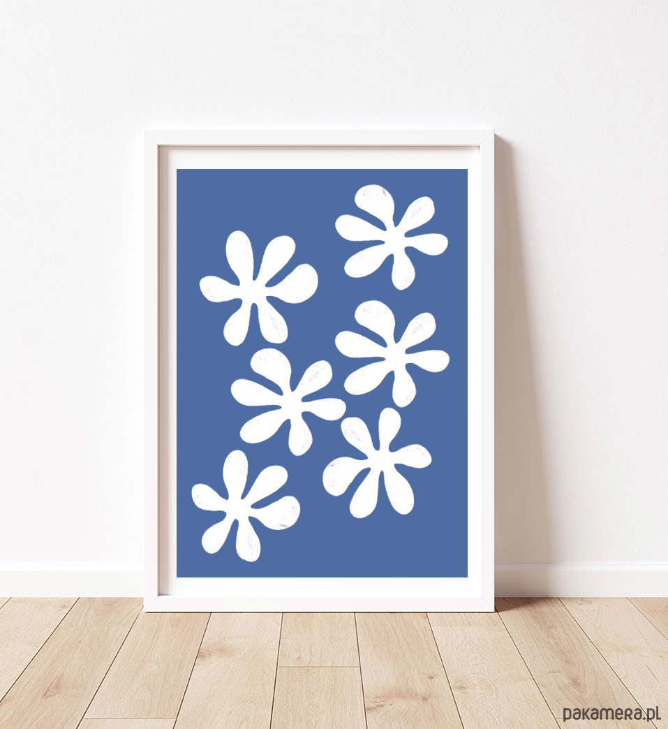 Ten abstrakcyjny plakat w kolorze niebieskim, z białymi motywami przypominającymi kwiaty, wprowadzi do wnętrza spokój i świeżość. Pięknie prezentuje się w jasnych, minimalistycznych wnętrzach. Spokojna, harmonijna kompozycja, autorski projekt.