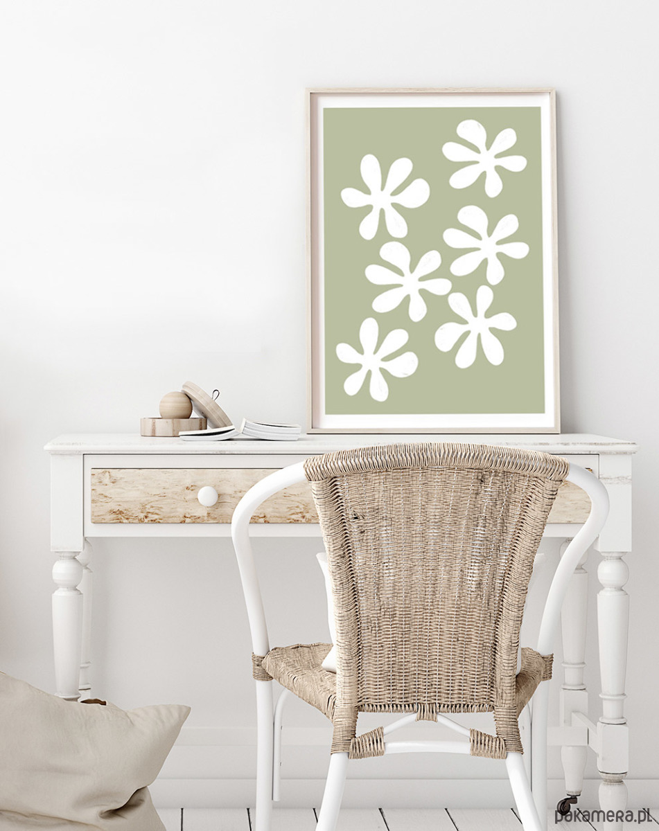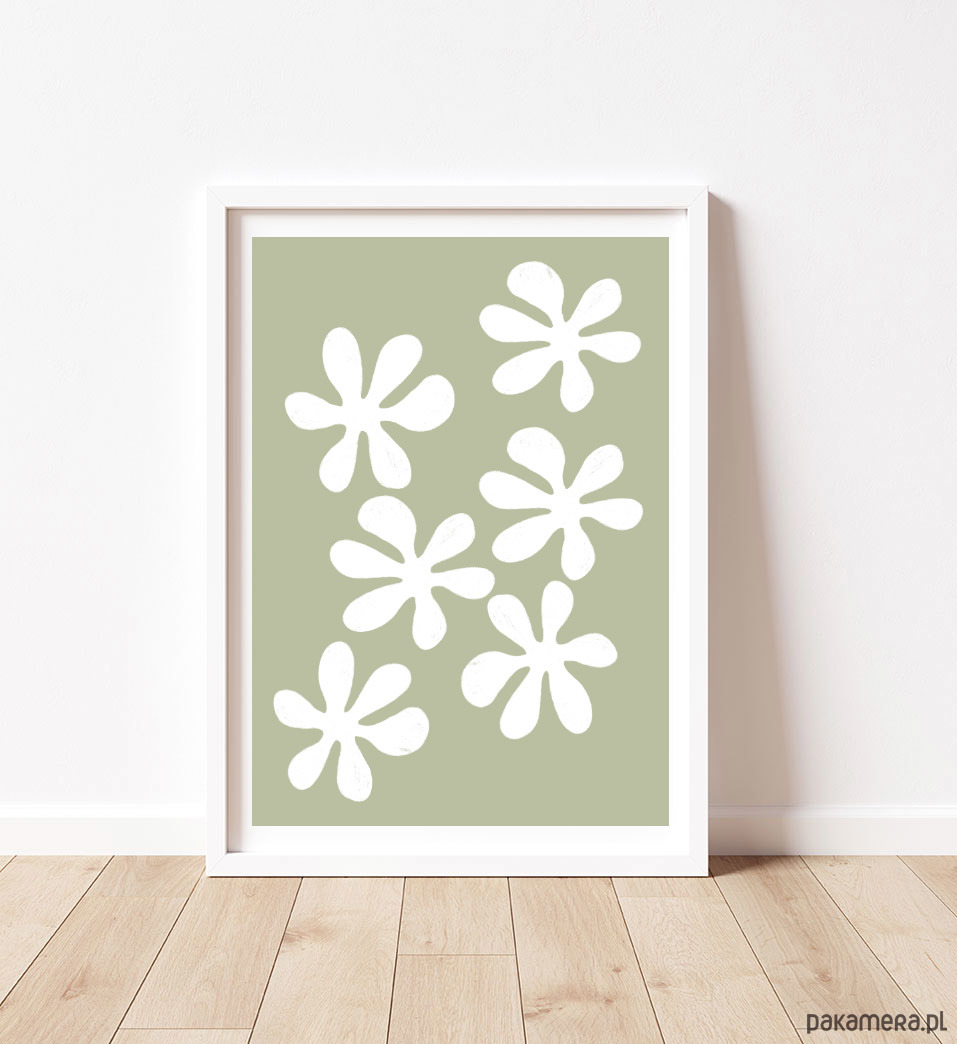 Ten abstrakcyjny plakat w kolorze khaki, z białymi motywami przypominającymi kwiaty, wprowadzi do wnętrza spokój i świeżość. Pięknie prezentuje się w jasnych, minimalistycznych wnętrzach. Spokojna, harmonijna kompozycja, autorski projekt.