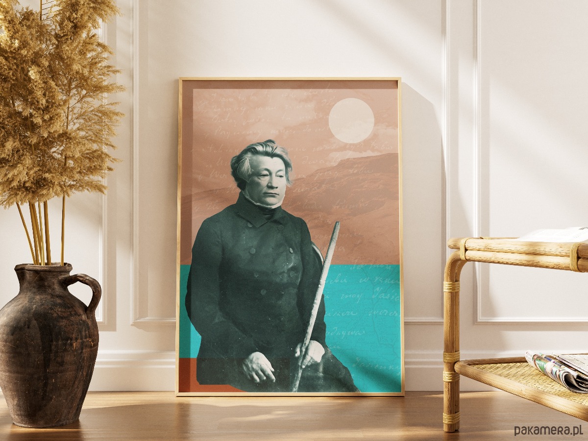 Plakat „Adam Mickiewicz” to hołd dla największego polskiego romantyka i jednego z najważniejszych poetów XIX wieku. Utrzymany w klimacie retro kolażu, nawiązuje do twórczości autora Pana Tadeusza, Dziadów i Sonetów krymskich. To wyjątkowa dekoracja dla miłośników literatury i polskiej historii, świetny prezent dla nauczyciela języka polskiego, pasjonata poezji czy kolekcjonera sztuki inspirowanej klasyką.