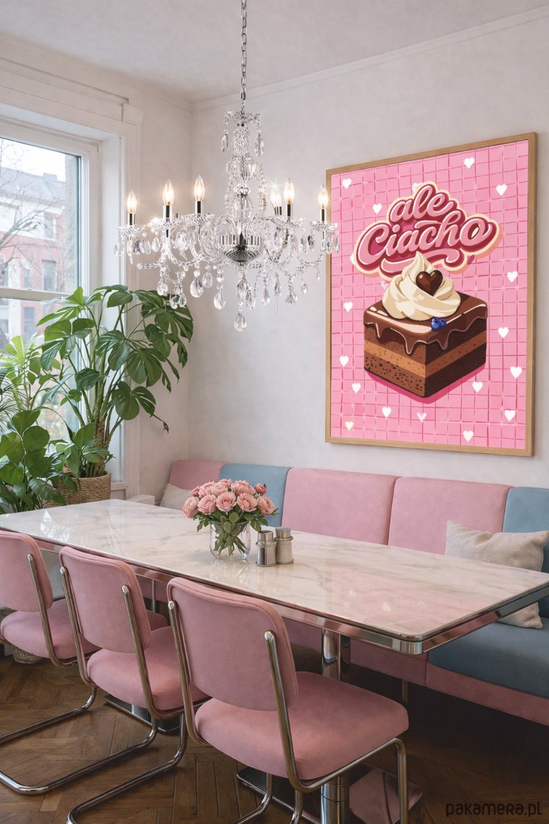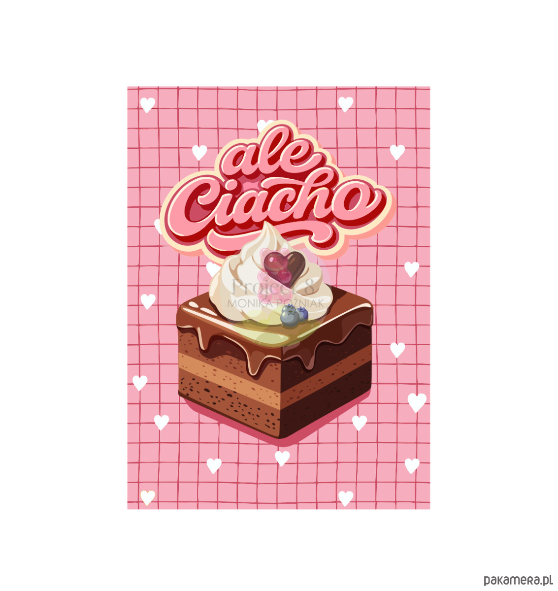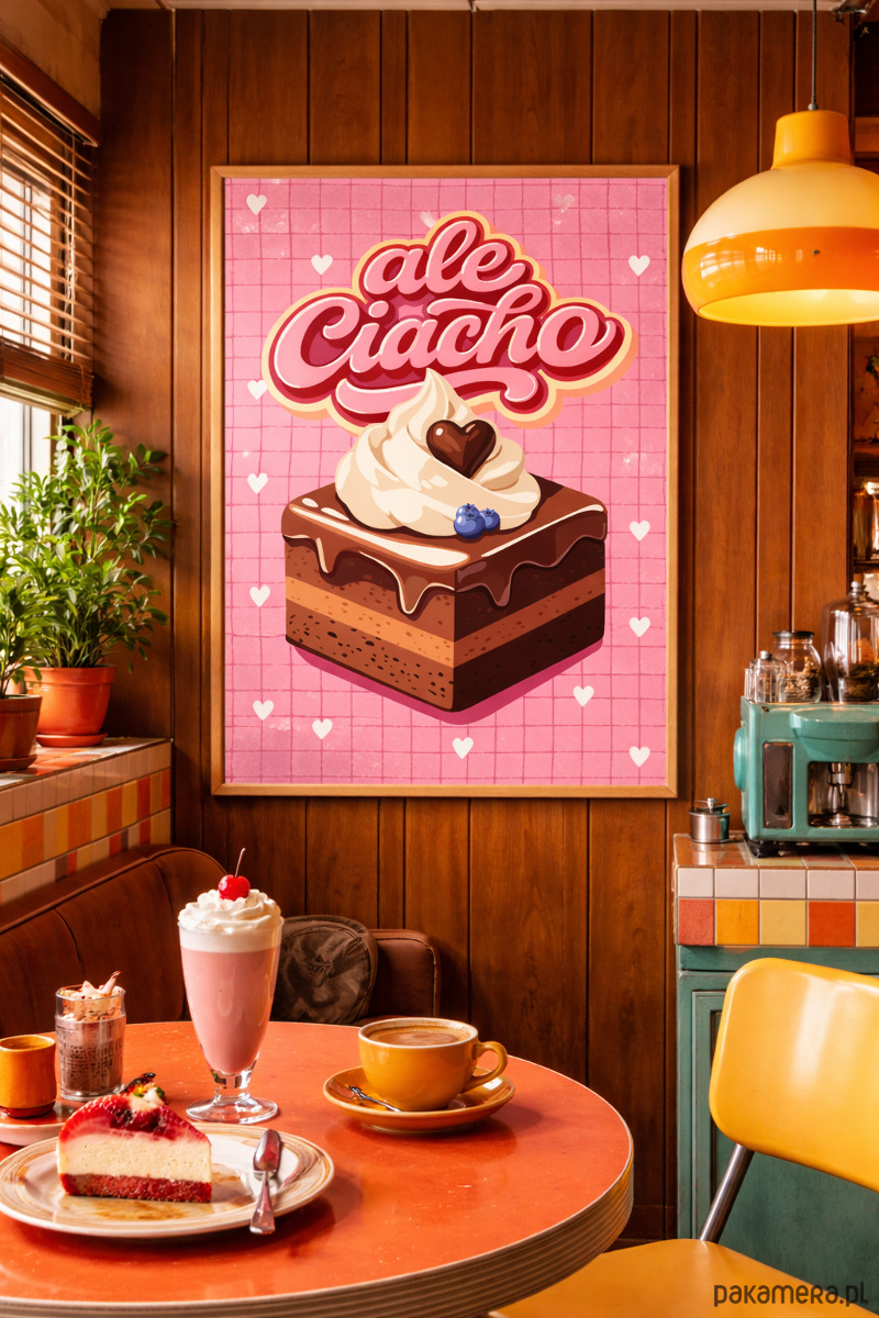 Słodka nostalgia zamknięta w formie plakatu. Motyw „Ale Ciacho” balansuje między lekkością a wyrazistością, przyciągając spojrzenie intensywną paletą różu i ciepłych tonów czekolady. To wizualna przyjemność, która działa natychmiast. Graficzna forma pozostaje czysta i świadoma, a retro inspiracje przełamane są nowoczesnym podejściem do koloru i kompozycji. To detal, który nie tylko zdobi, ale tworzy atmosferę lekką i beztroską. Plakat wykonany w formie grafiki wektorowej.