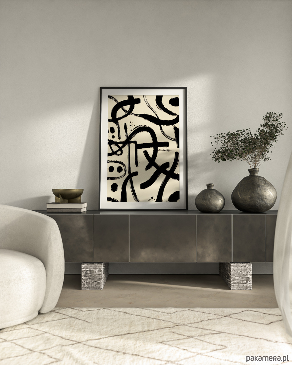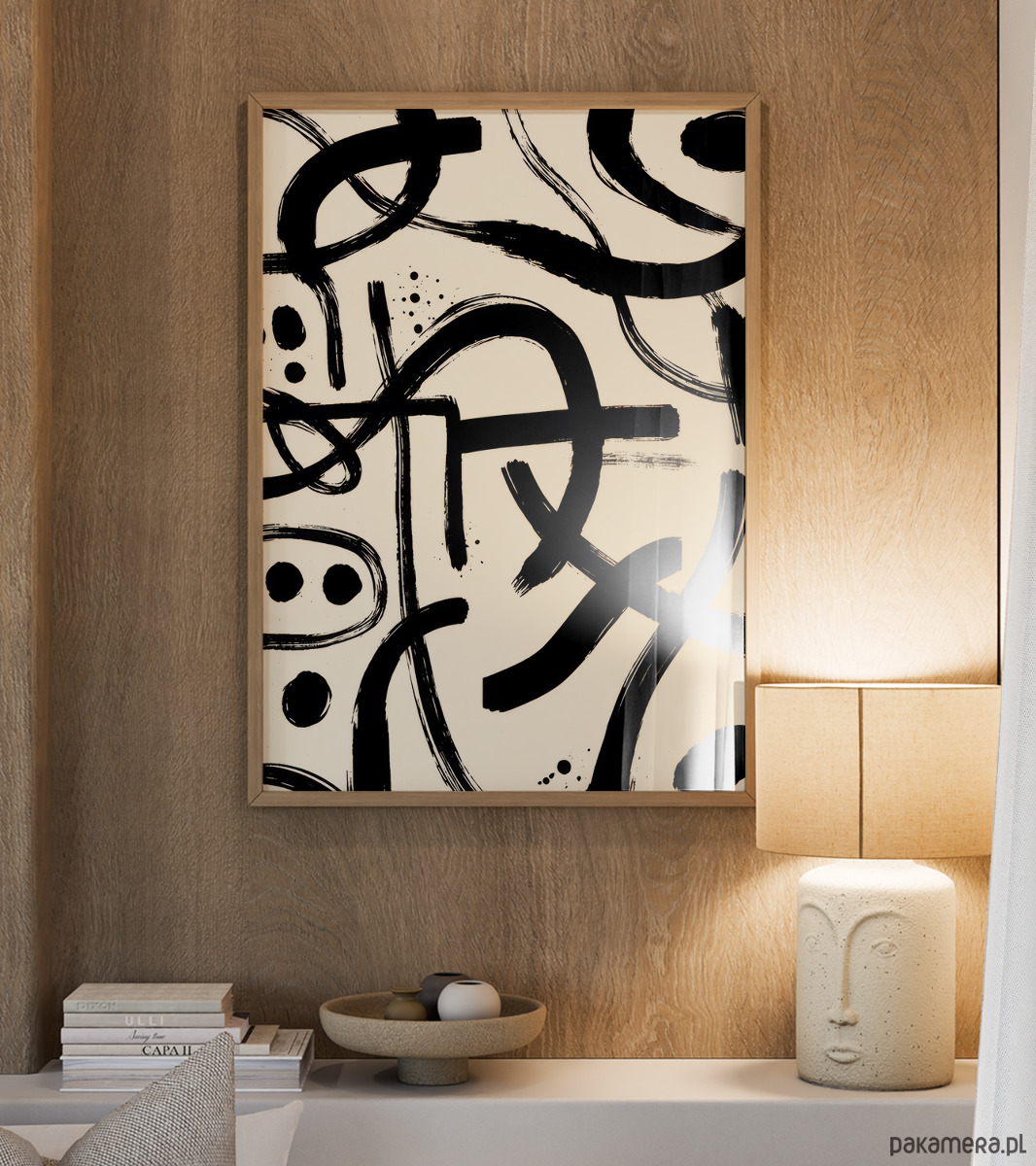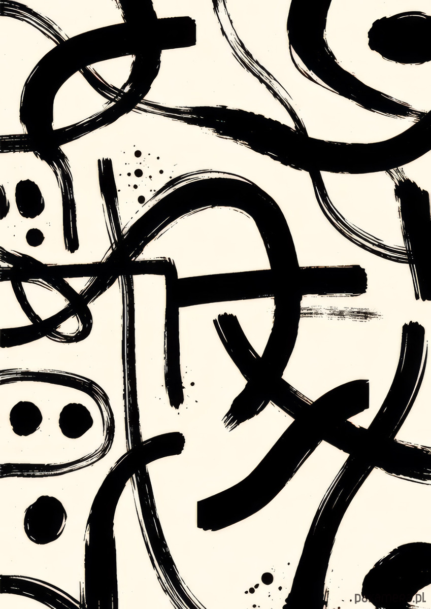 Dynamiczna energia w klasycznej palecie. Plakat ten łączy surową ekspresję czerni i bieli, tworząc wyrazistą, chaotyczną kompozycję pełną kontrastów. Grube, malarskie pociągnięcia pędzla splatają się w abstrakcyjny wzór, pełen zakrętów, linii i plam. Z jednej strony sprawia wrażenie zawiłej narracji, z drugiej — jest jak zapis nieokiełznanych myśli, które zderzają się w intensywnym ruchu.