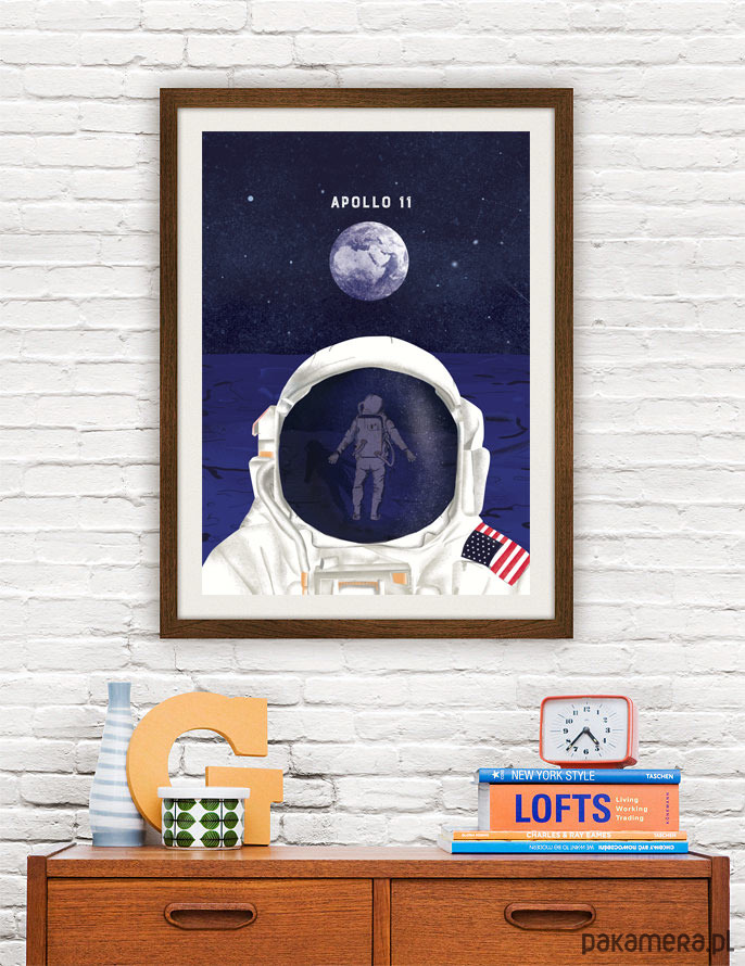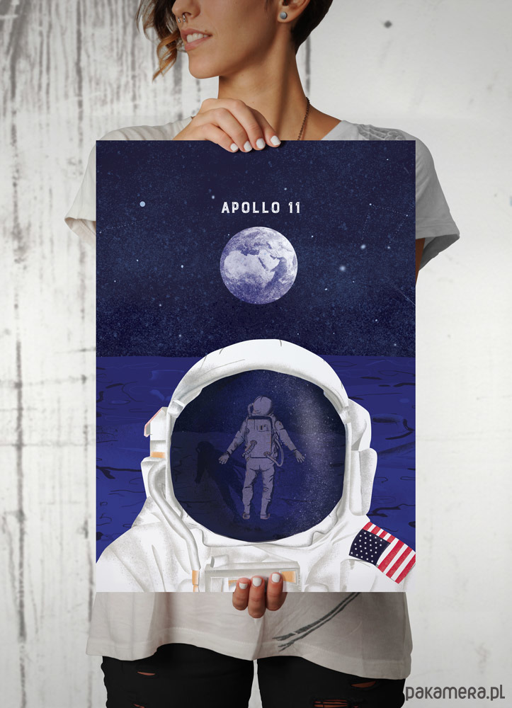 Plakat z autorską grafiką Joanny Basicz inspirowaną misją kosmiczną Apollo 11, której głównym celem było pierwsze lądowanie człowieka na Księżycu oraz filmem dokumentalnym powiadającym o niej.