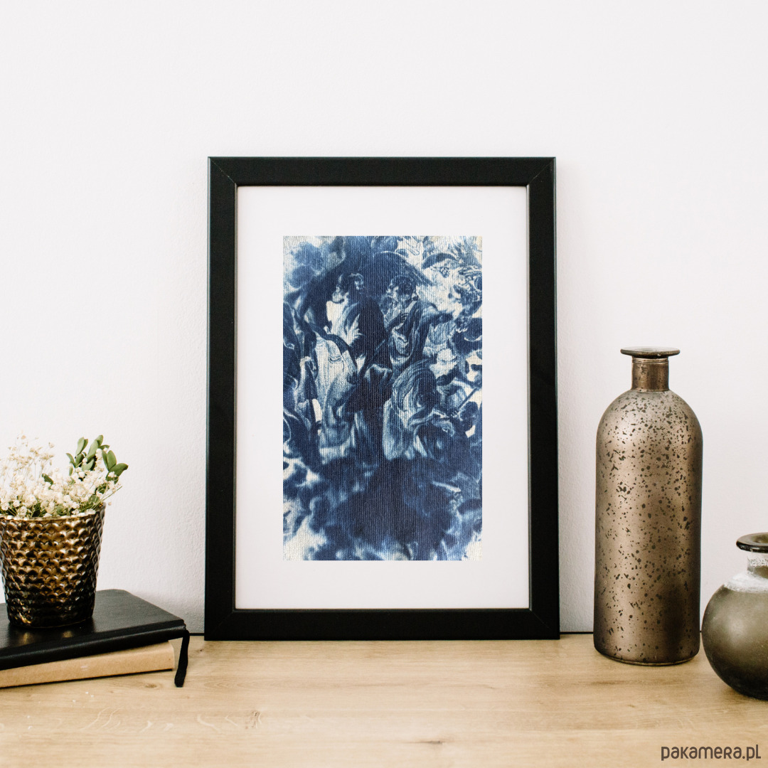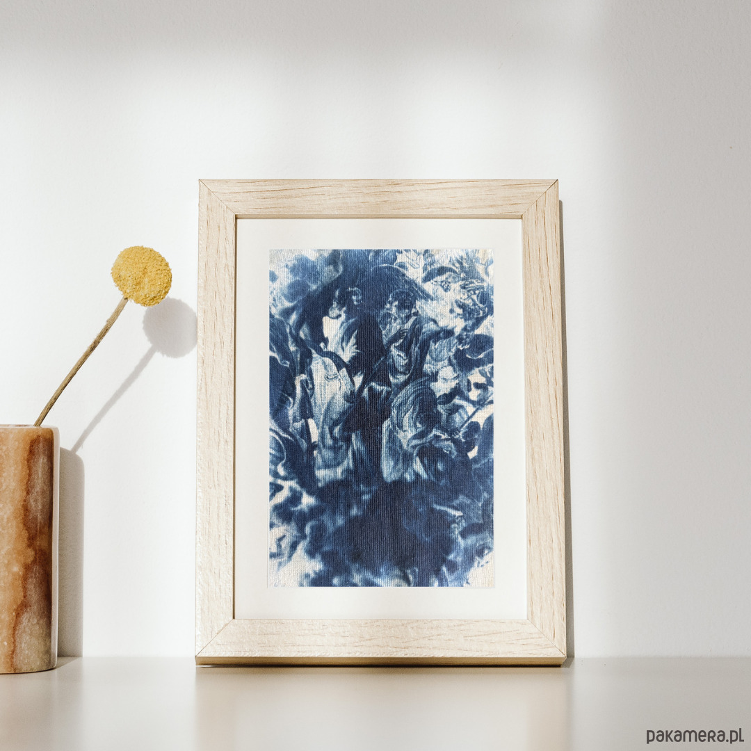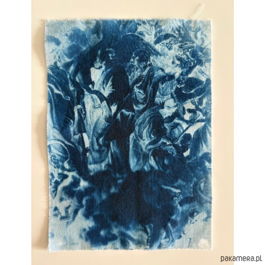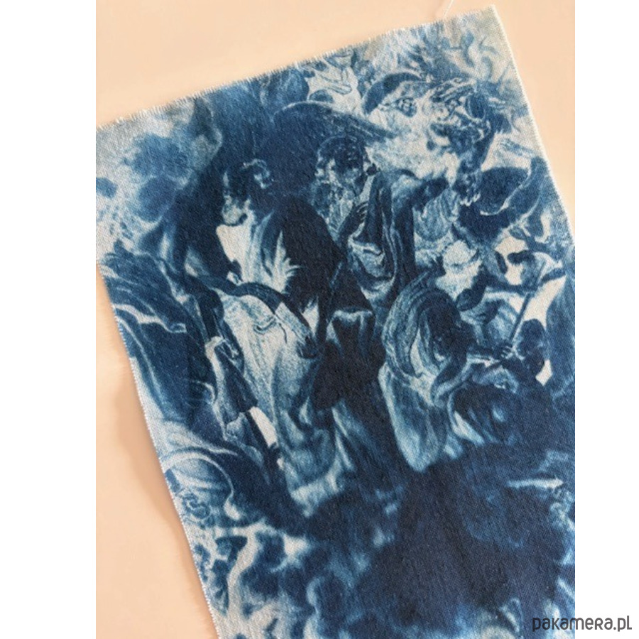 Unikatowa praca wykonana ręcznie techniką cyjanotypii na 100% bawełnianym materiale. Powstała na podstawie mojego autorskiego kolażu i została wywołana tradycyjną metodą światłoczułą przy użyciu światła słonecznego.