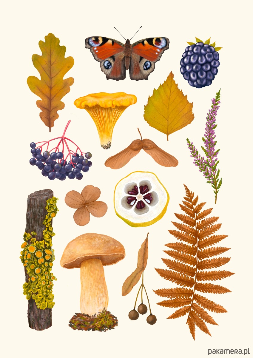 Plakat "Babie lato" to autorska ilustracja przedstawiająca elementy kojarzące się z początkiem jesieni. Przywodzi na myśl coraz chłodniejsze poranki, zaczynające się przebarwiać liście oraz owocowy zapach pigwowców i opadniętych jabłek. Na plakacie znajdują się między innymi porosty, motyl pawie oczko, nasionka lipy i ususzony kwiat hortensji.