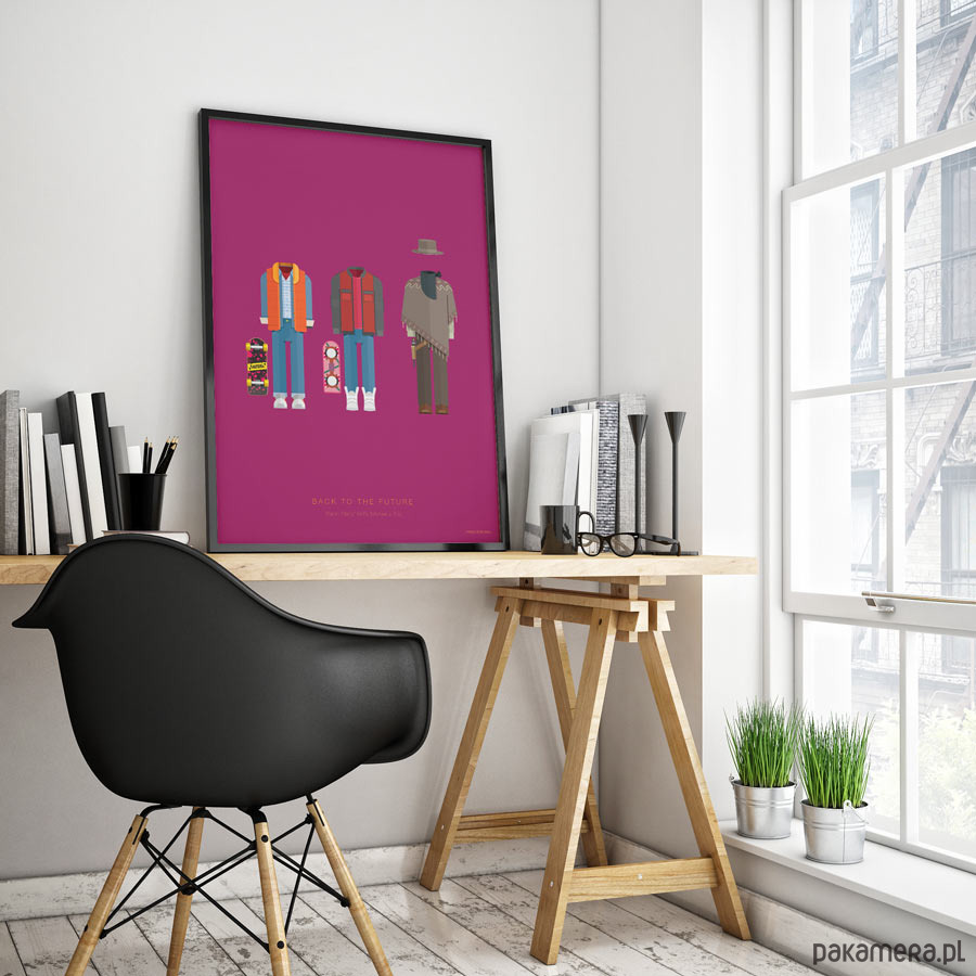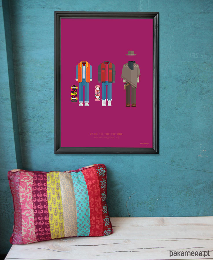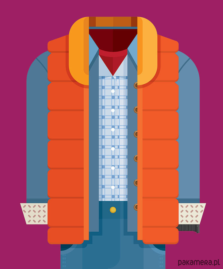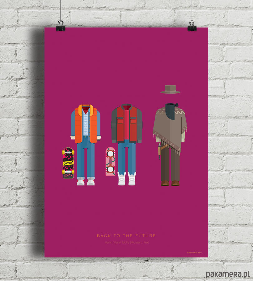 Plakat z autorską grafiką inspirowaną filmem "Powrót Do Przyszłości" (Back To The Future), reż. Robert Zemeckis. Pochodzi z serii "Cinema Costumes" (Kostiumy kinowe) i przedstawia stroje Marty'ego McFly'a.