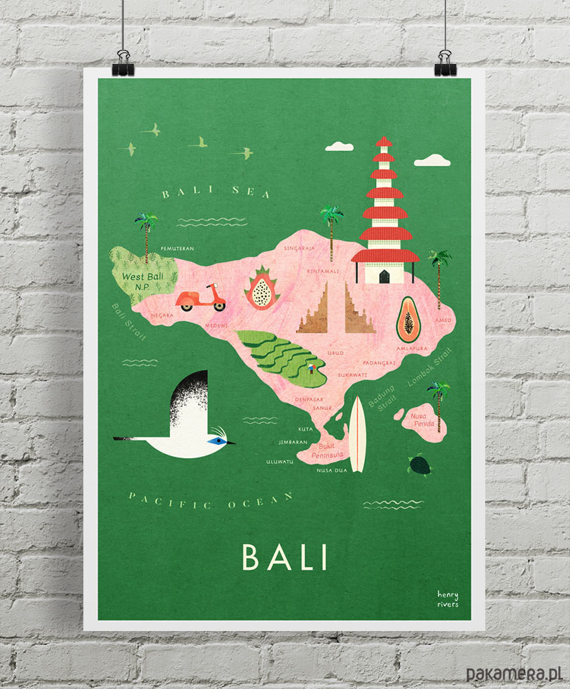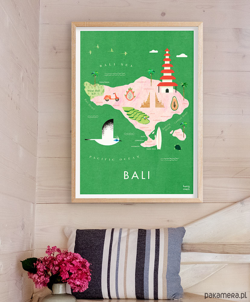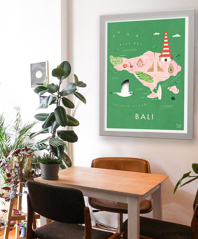 Plakat z indonezyjską wyspą Bali w formie graficznej mapy. Ten rajski zakątek wypełniony surferskimi plażami, magiczną przyrodą i pięknymi świątyniami to wakacyjna podróż marzeń. Nasz plakat utrzymany w soczyście zielonym kolorze przywodzi na myśl bujną, wyspiarską przyrodę. Ożywi każde wnętrze.
