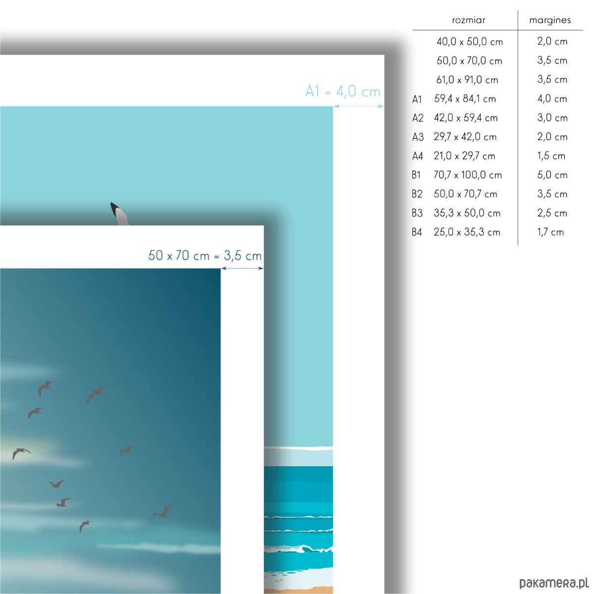 Biały margines dookoła grafiki jest integralną częścią plakatu. Szczegółowe dane w tabeli na zdjęciu nr 3. Na życzenie możliwość zmiany rozmiaru obszaru zadrukowanego oraz wydruku dowolnego formatu - np. pod passe-partout.