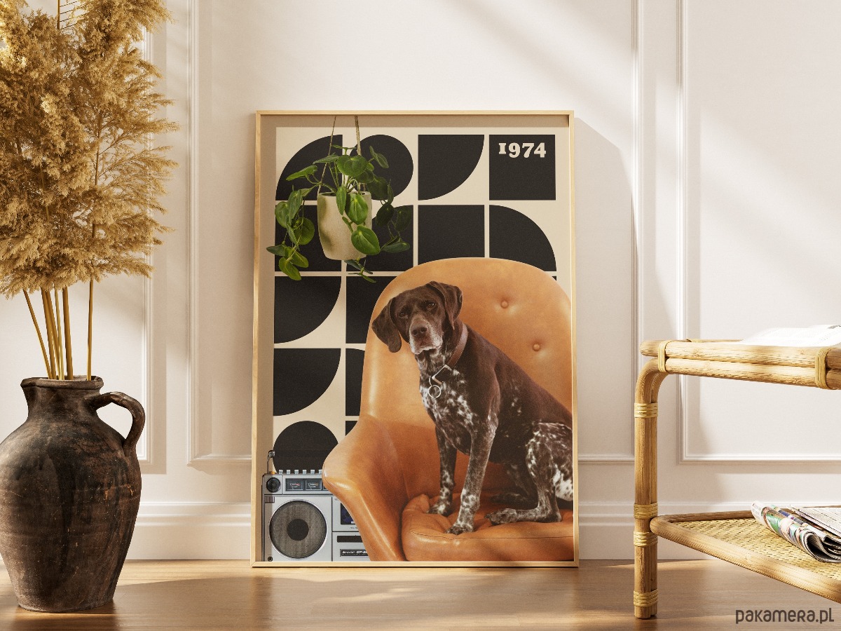 Plakat stylizowany na estetykę katalogów wnętrz z przełomu lat 70, gdzie geometryczne wzory, retro meble, radio kasetowe i wisząca roślina tworzą klimat epoki, w której design łączył prostotę z odważną formą. Całość uzupełnia obecność psa, najlepszego przyjaciela człowieka, symbolu lojalności, ciepła i codziennej bliskości. To wierny towarzysz i najlepszy przyjaciel człowieka, obecny w każdym domu pełnym serca i rodzinnej atmosfery.