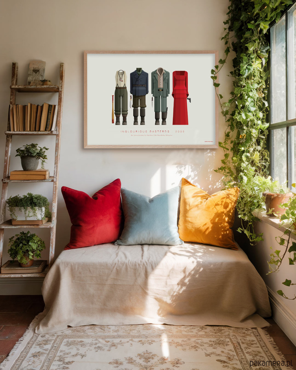 Plakat inspirowany filmem Bękarty wojny (Inglourious Basterds), reż. Quentin Tarantino. Grafika przedstawia trzy kostiumy "bękartów" i czerwoną, balową suknię Shosanny.