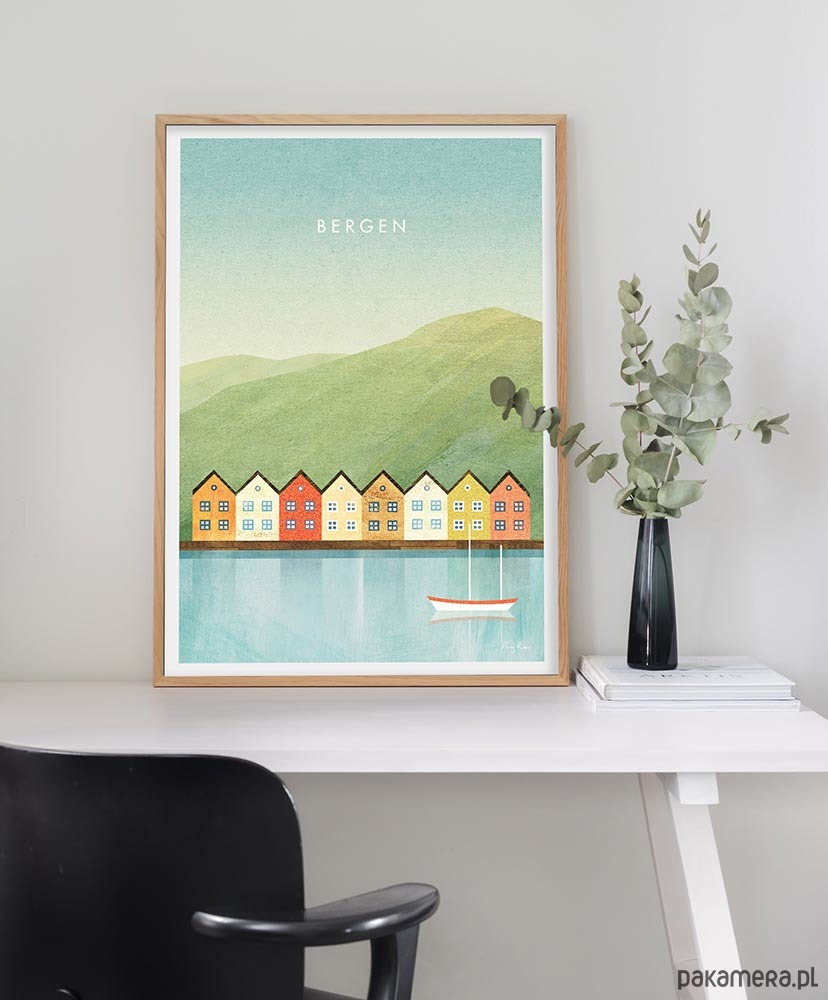 Plakat podróżniczy z daleką północą - pocztówkowo malowniczym Bergen w Norwegii. Nazywane bramą do fiordów, wpisane na listę światowego dziedzictwa UNESCO, portowe Bergen zachwyci każdego.