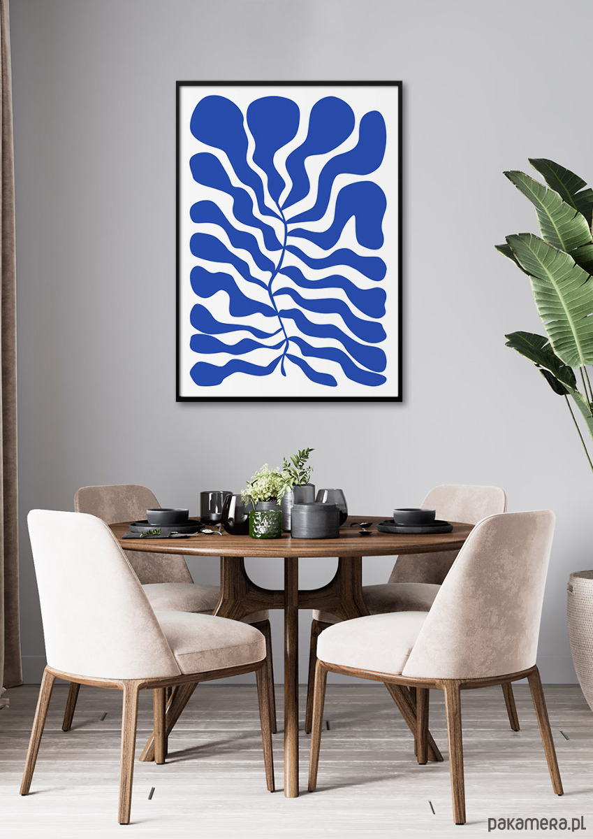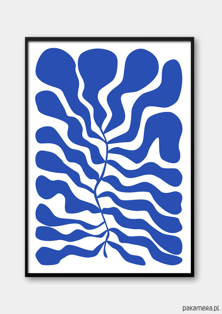 Elegancki plakat w stylu modern organic przedstawiający abstrakcyjną kompozycję roślinną w intensywnym odcieniu błękitu. Dynamiczne formy tworzą harmonijny rytm i nadają wnętrzu wyrazisty, designerski charakter. Kompozycja zachowuje równowagę pomiędzy ekspresją a minimalizmem. Ograniczona paleta barw podkreśla czystość formy i nadaje jej elegancji.