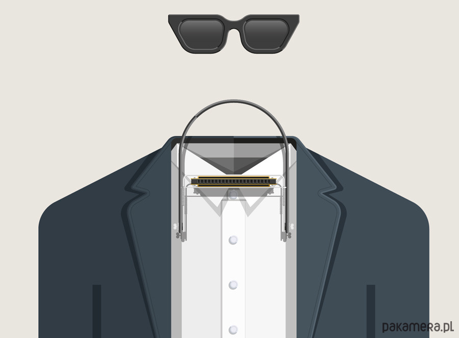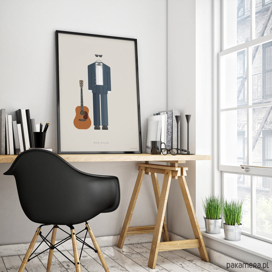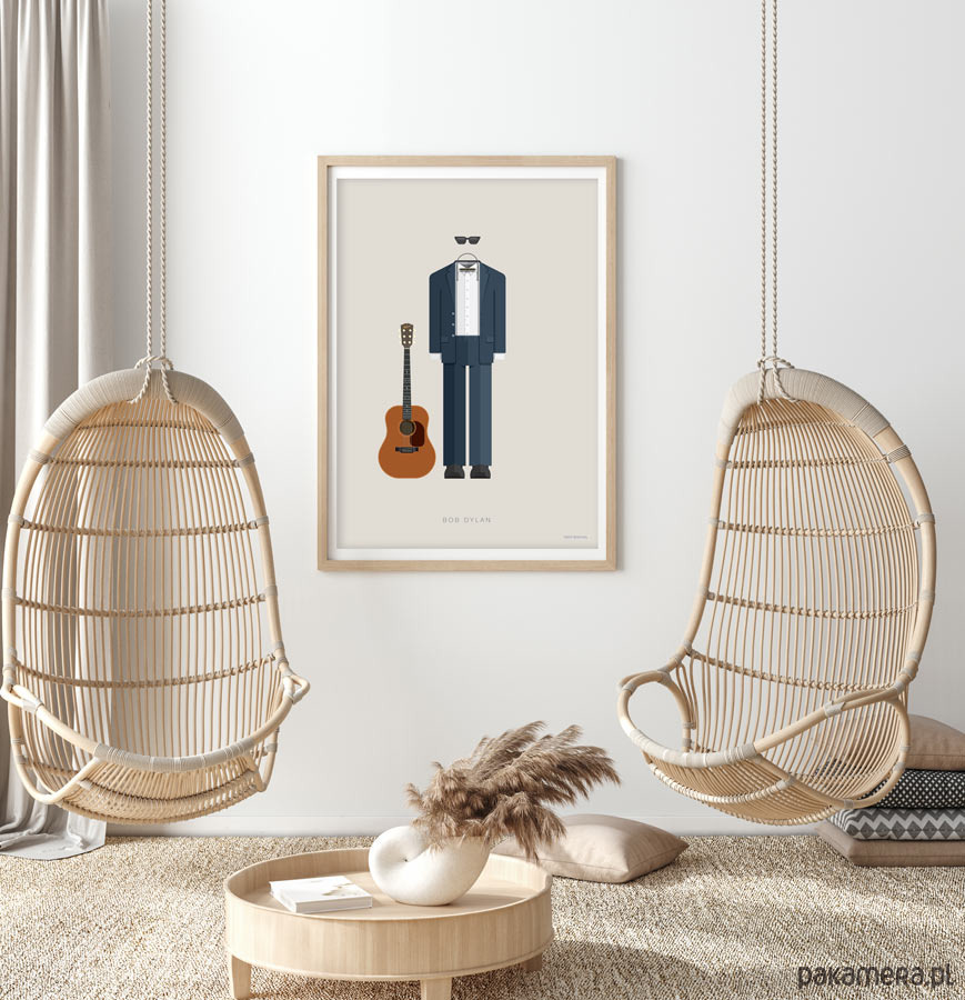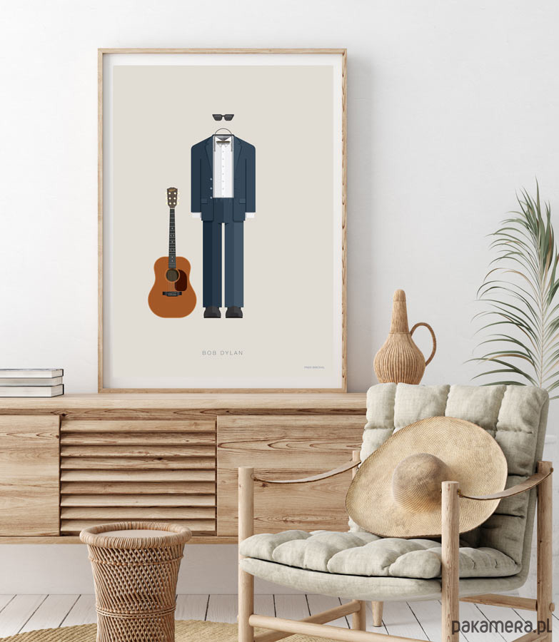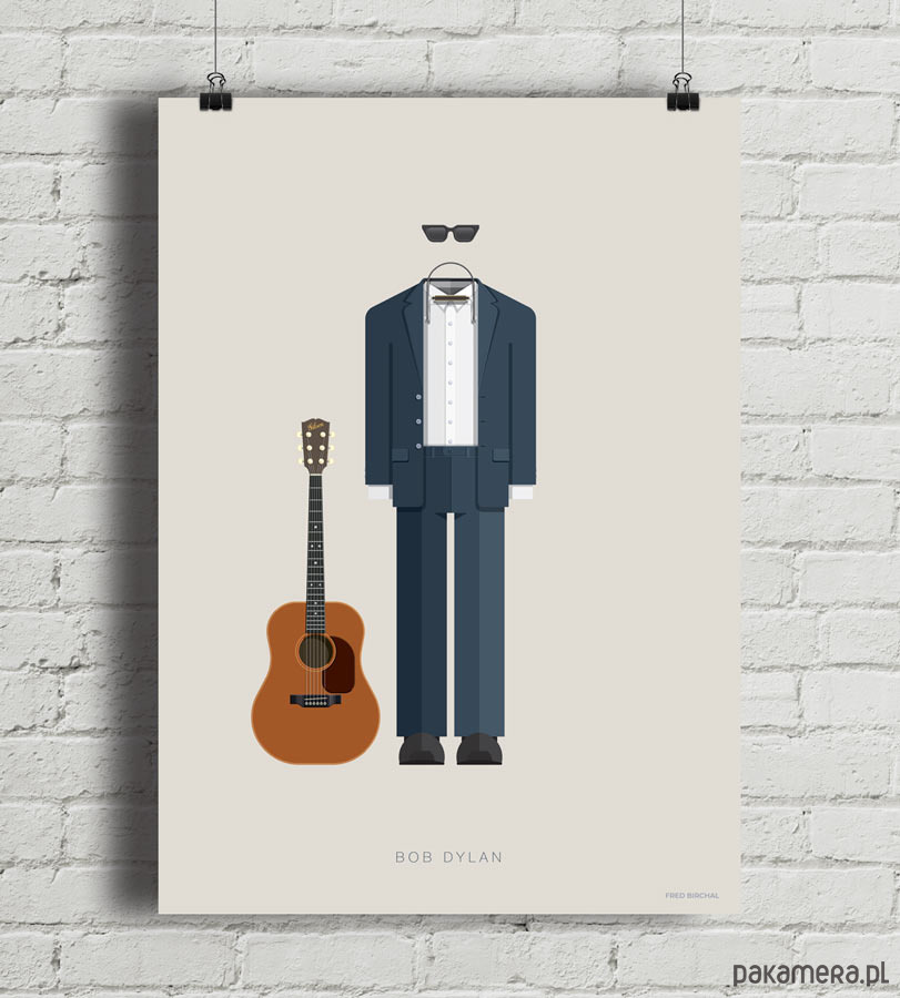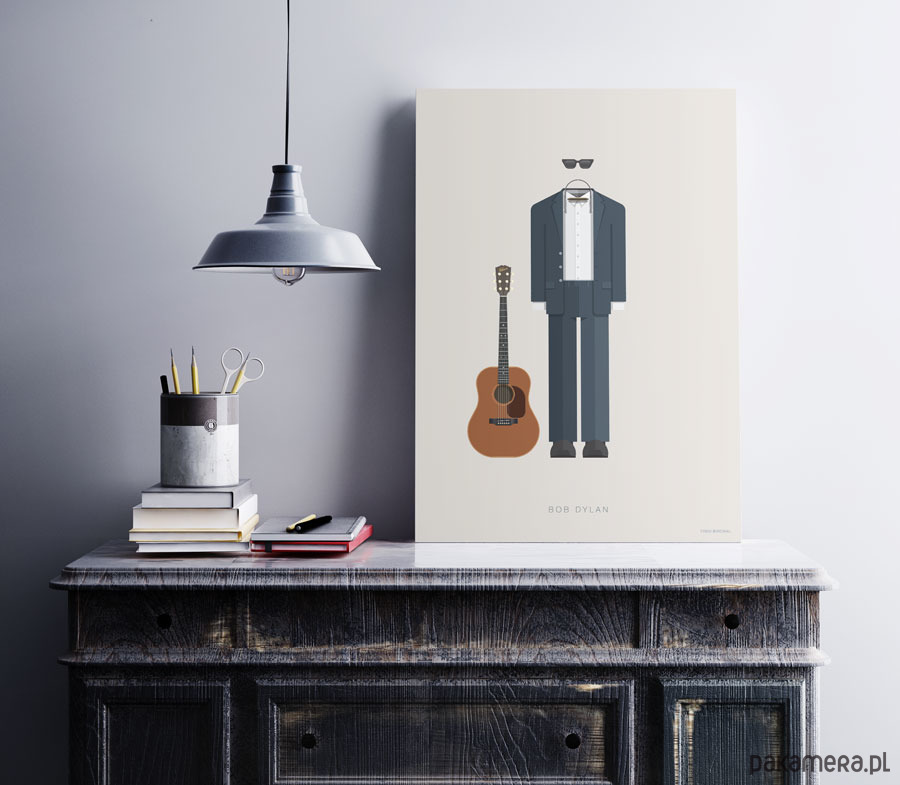 Plakat z autorską grafiką inspirowany piosenkarzem i poetą Bobem Dylanem. Pochodzi z serii "Kostiumy muzyczne" i przedstawia klasyczną stylizację muzyka - garnitur, nieodłączną gitarę i harmonijkę.