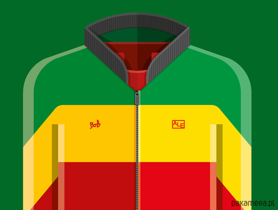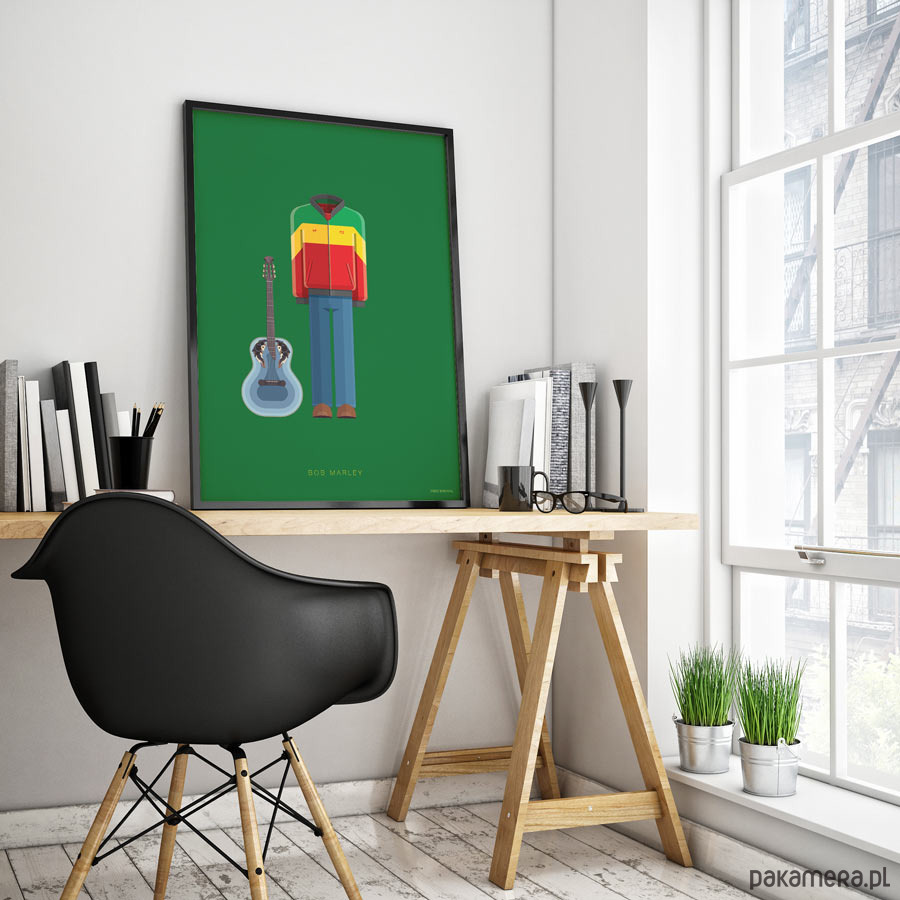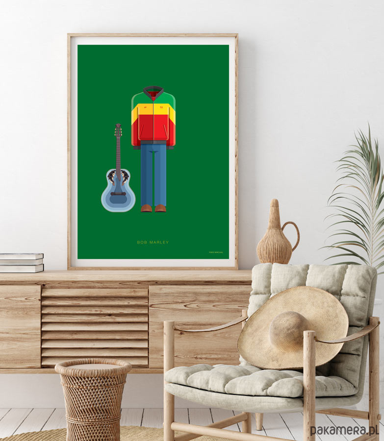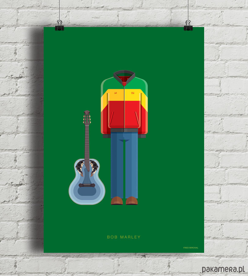 Plakat z autorską grafiką inspirowany legendą reggae Bobem Marleyem. Pochodzi z serii "Kostiumy muzyczne" i przedstawia charakterystyczny ubiór muzyka z bluzą, której barwy odwołują się do ruchu Rastafari.