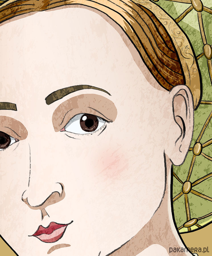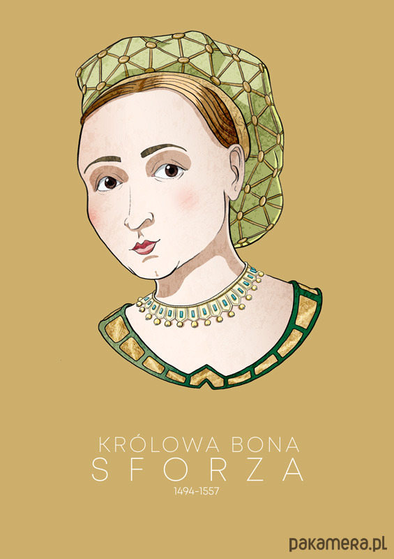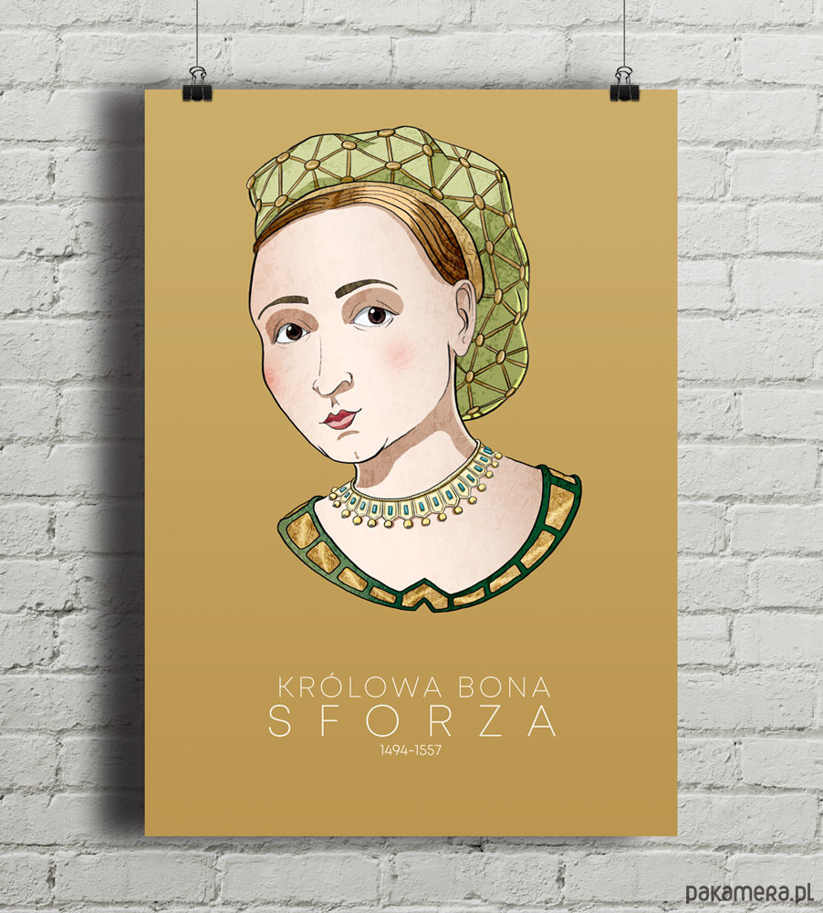 Plakat z autorską grafiką Michała Szweda inspirowany postacią Bony Sforzy, królowej Polski. Pochodzi z serii "Polki/Polacy"