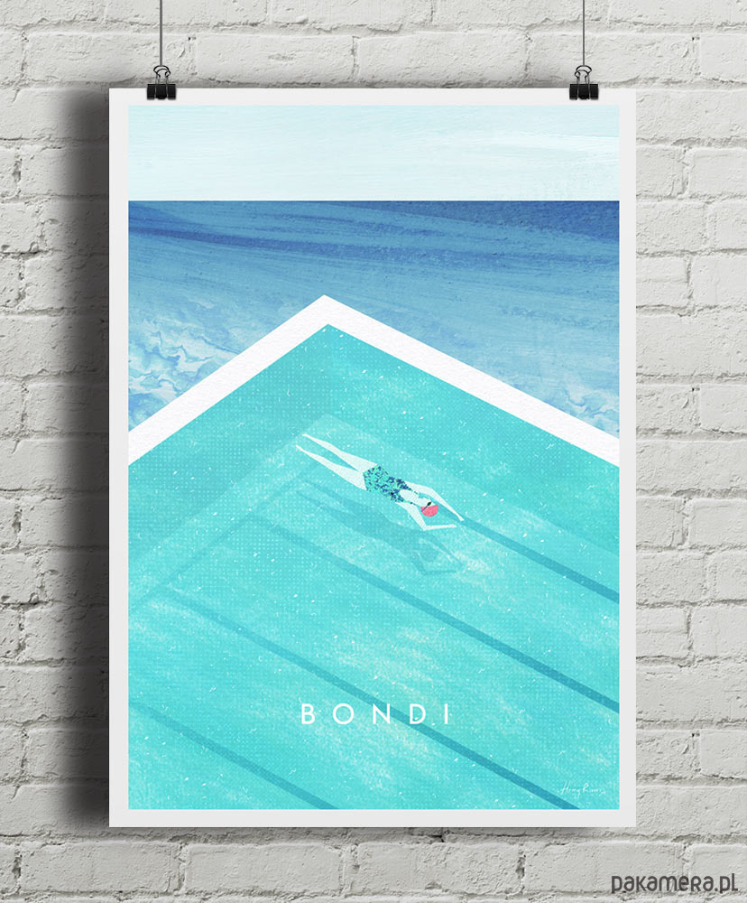 Bondi Beach - marzenie surferów i plażowiczów - na plakacie ujęte w odrobinę odmienny sposób. Zamiast piaszczystej plaży i wysokich fal, widzimy spokojną pływaczkę unoszącą się na lazurowych wodach basenu. To oczywiście słynny Bondi Icebergs Club malowniczo usytuowany nad samym oceanem.