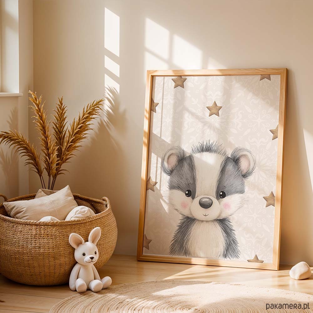 Uroczy plakat z borsukiem w delikatnych, beżowych odcieniach to idealna dekoracja do pokoju malucha. Ilustracja przedstawia spokojnego borsuka w otoczeniu subtelnych gwiazdek, tworząc ciepłą, przytulną atmosferę sprzyjającą odpoczynkowi i marzeniom. Stonowana kolorystyka sprawia, że plakat doskonale wpasuje się zarówno w pokoje dziewczynek, jak i chłopców, a także świetnie komponuje się z wystrojem w stylu boho, skandynawskim czy naturalnym.