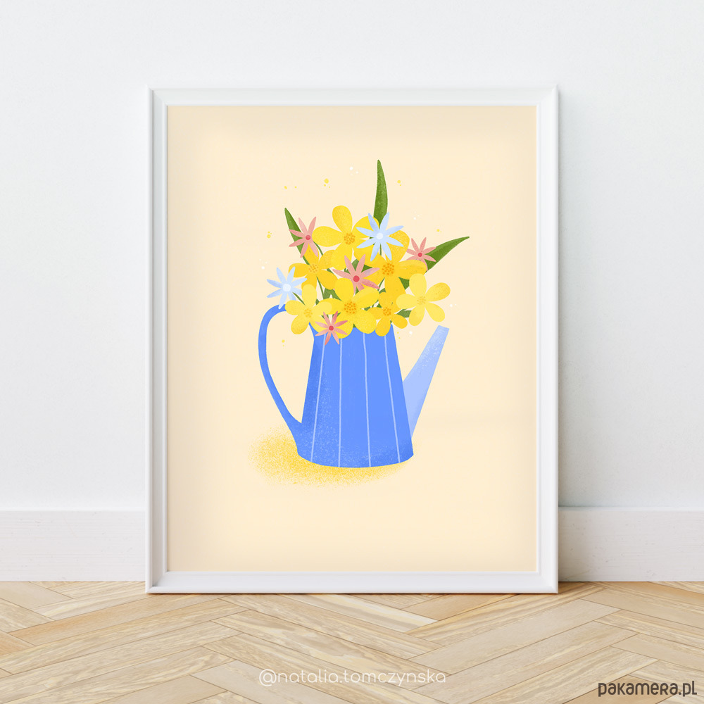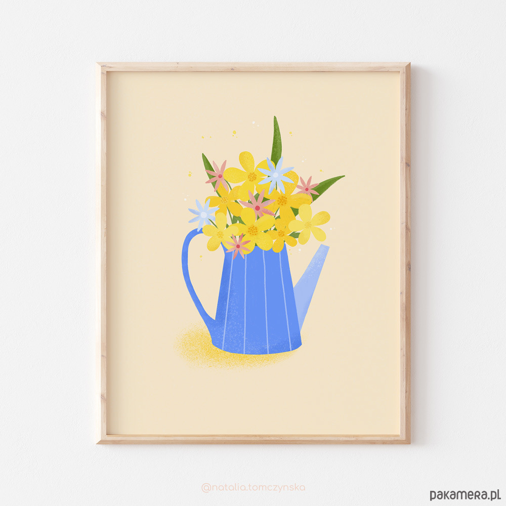 Letnie kwiatki w niebieskiej konewce, na jasno żółtym tle wprowadzą do każdego wnętrza lato.