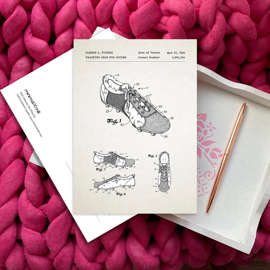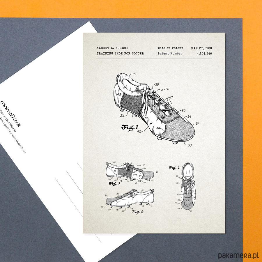 Kartka z reprodukcją patentu na piłkarski but treningowy, tzw. korek. Patent zaprojektowany przez Alberta L.Fugere. Patent o numerze 4,204,346 został udzielony w 1980 roku przez Urząd Patentów i Znaków Towarowych Stanów Zjednoczonych.