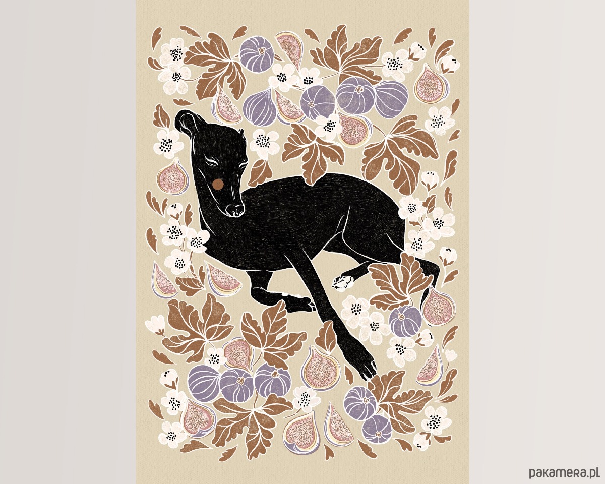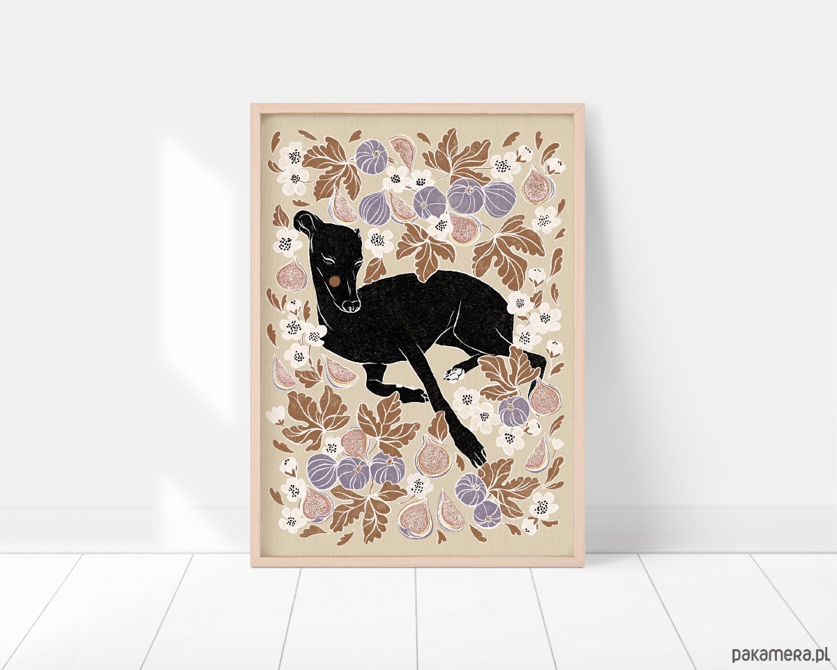 Grafika przedstawiająca charcika w gałązkach i owocach figowych będzie idealnym uzupełnieniem wnętrz oraz prezentem dla miłośników chartów.