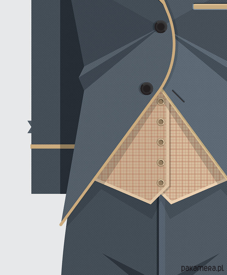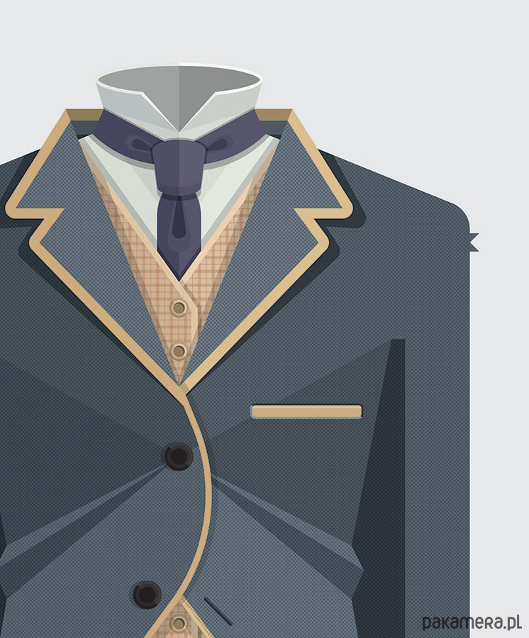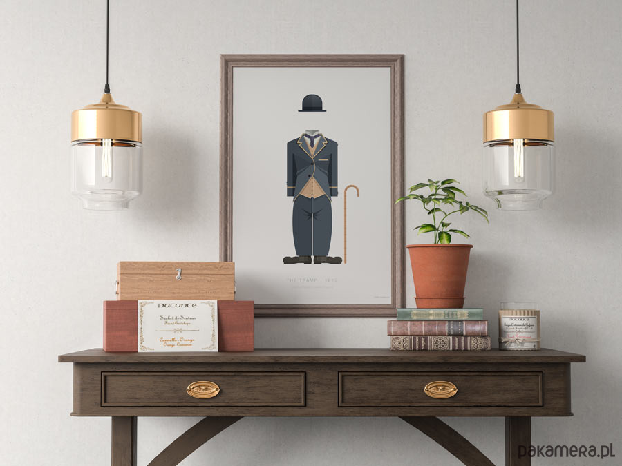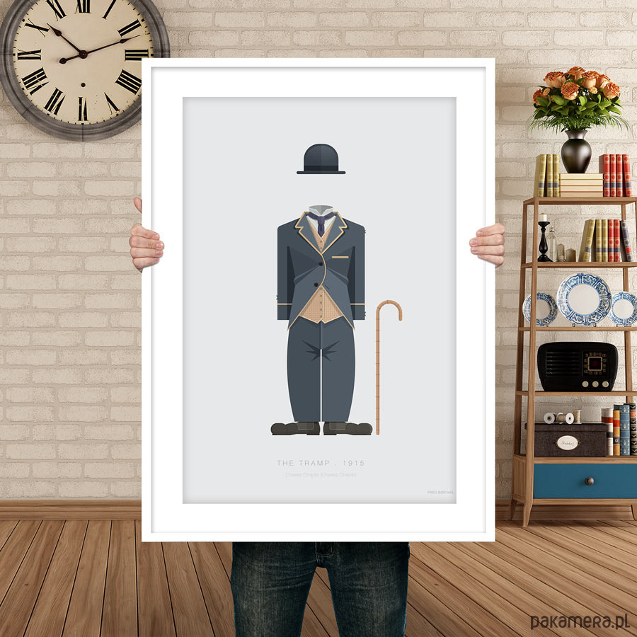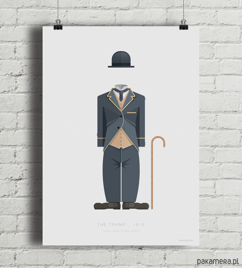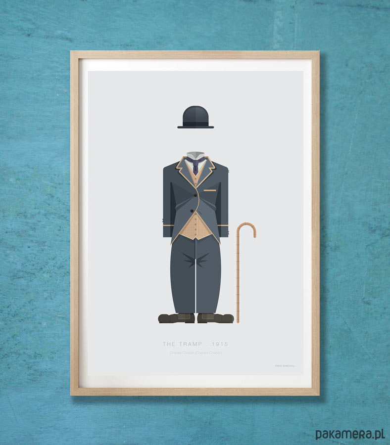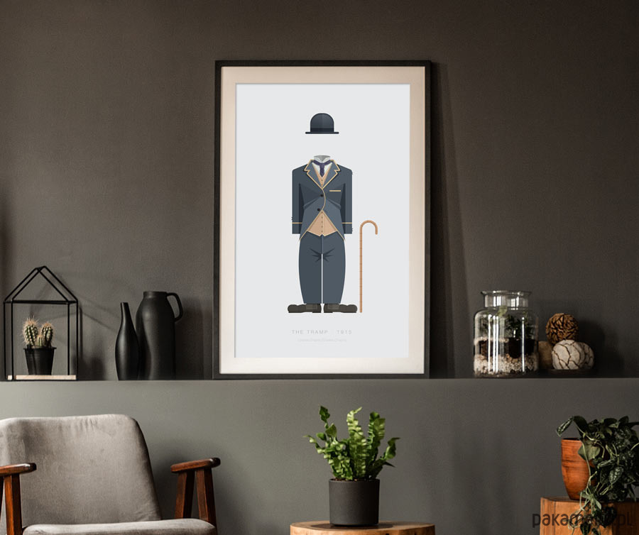 Plakat z autorską grafiką inspirowaną filmem "Włóczęga" (The Tramp) z 1915 roku. Pochodzi z serii "Cinema Costumes" (Kostiumy kinowe) i przedstawia słynny strój Carliego Chaplina.