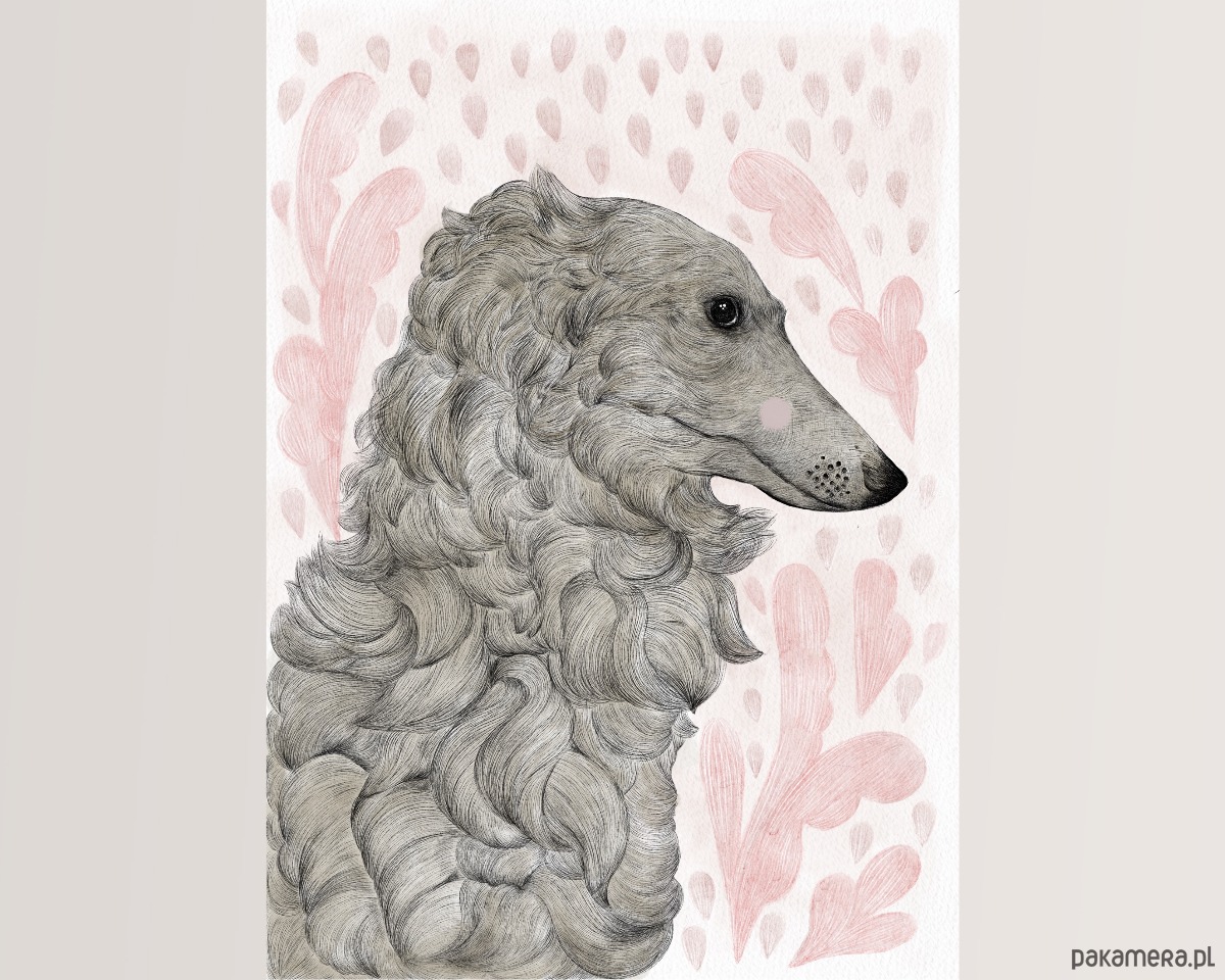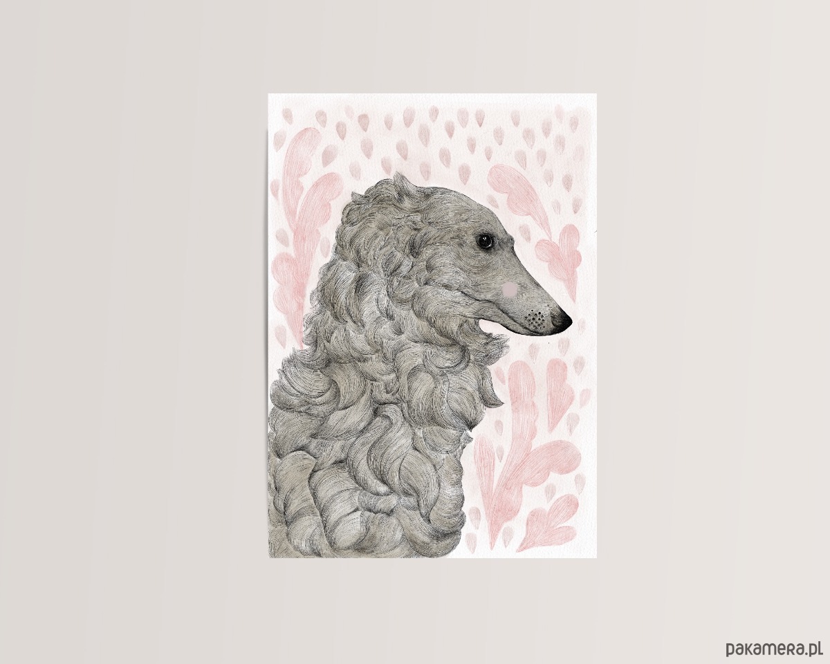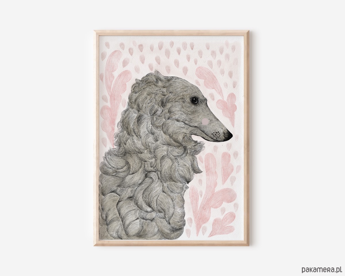 Grafika przedstawiająca charcika w wiosennym deszczyku będzie idealnym uzupełnieniem wnętrz lub prezentem dla miłośników piesków.
