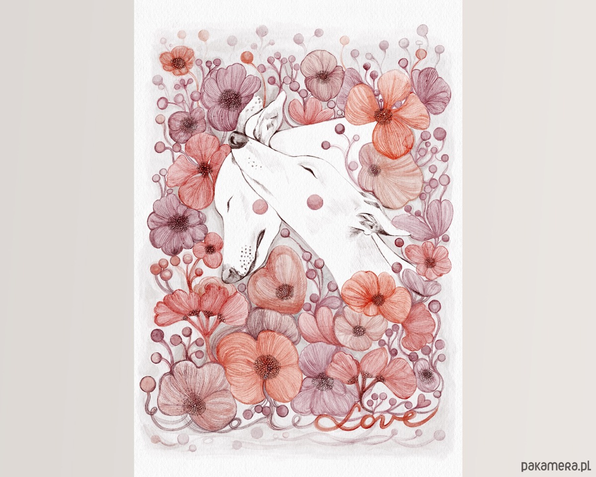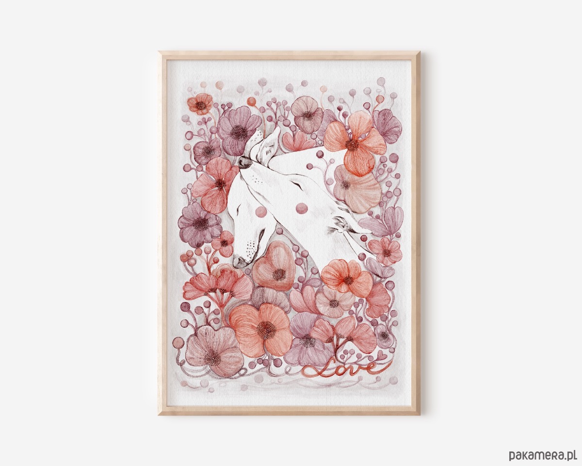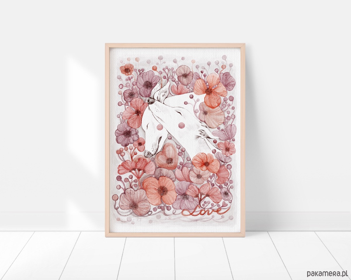 Grafika przedstawiająca charciki w kwiatach będzie idealnym uzupełnieniem wnętrz.