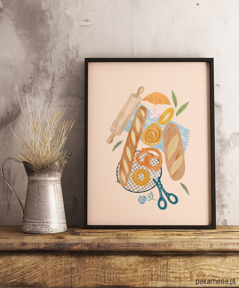 Francuska piekarnia o poranku i zapach świeżo wypiekanego pieczywa to przepis na udany poranek. Plakat Chrupiące bagietki idealnie sprawdzi się jako dekoracja kuchni i jadalni.