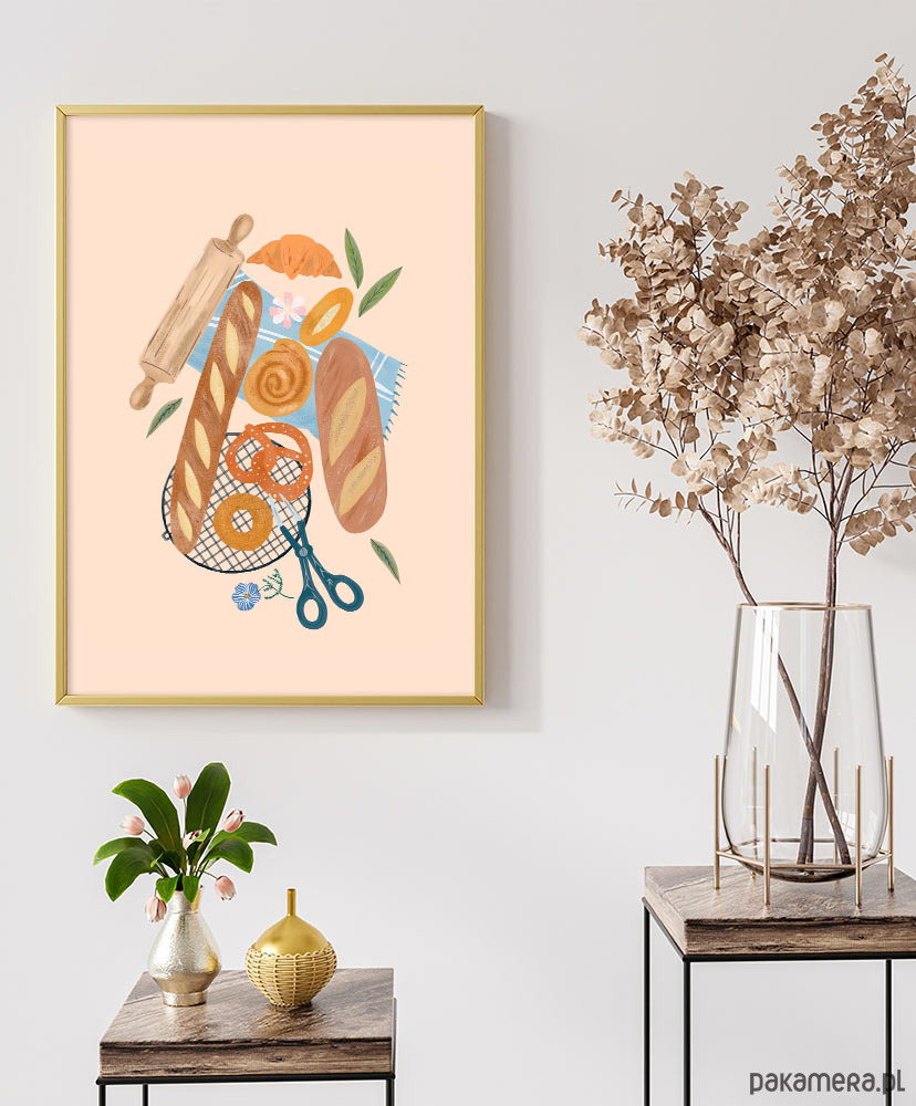 Francuska piekarnia o poranku i zapach świeżo wypiekanego pieczywa to przepis na udany poranek. Plakat Chrupiące bagietki idealnie sprawdzi się jako dekoracja kuchni i jadalni.