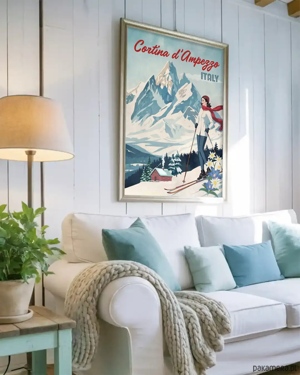 Plakat "Cortina d’Ampezzo Włochy" przenosi nas w samo serce zasypanych śniegiem Dolomitów. Malownicze trasy narciarskie, zachwycające widoki, uczyniły z włoskiego miasteczka stolicę sportów zimowych. Cortina d’Ampezzo już dwukrotnie ciszyć się mogła mianem gospodarza Zimowych Igrzysk Olimpijskich.
