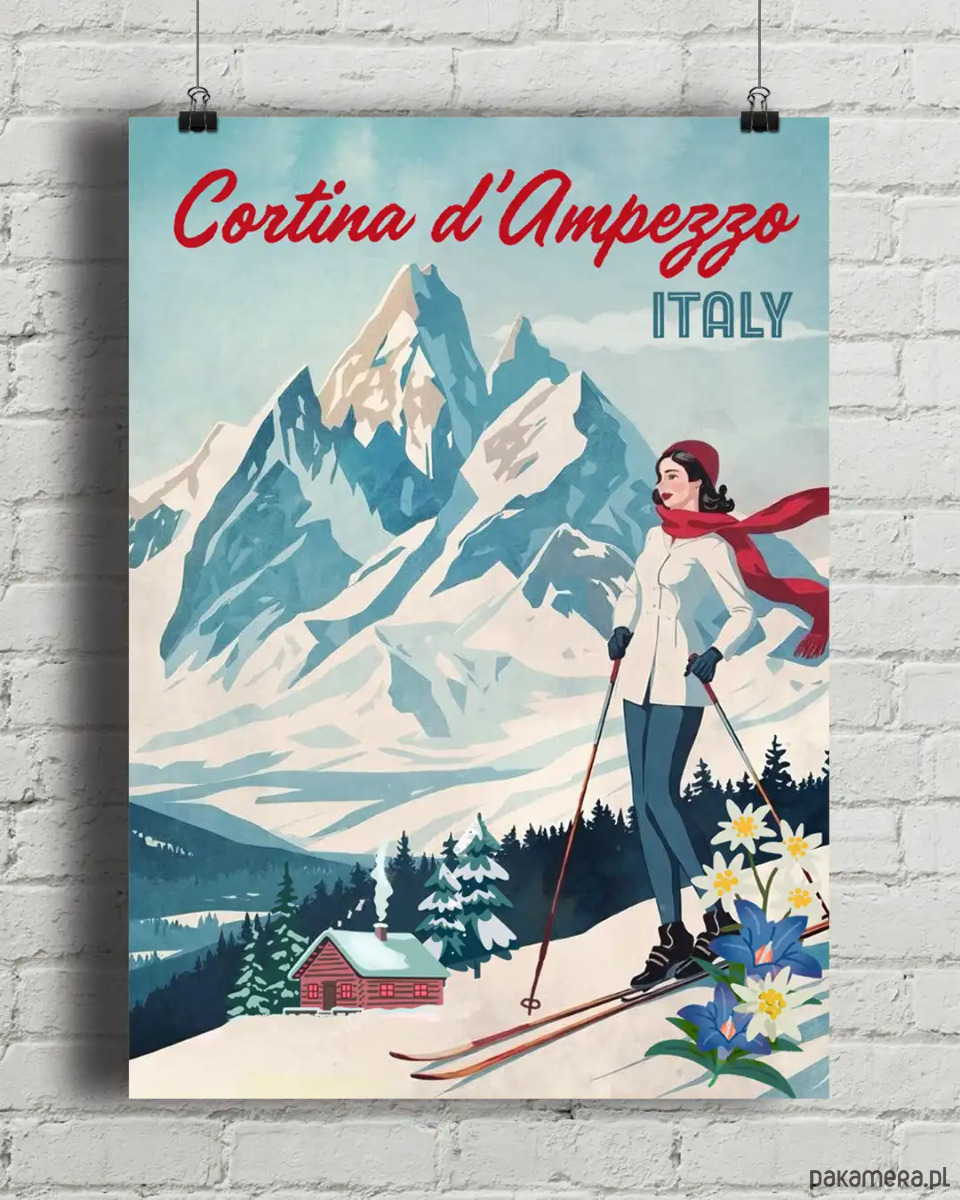Plakat "Cortina d’Ampezzo Włochy" przenosi nas w samo serce zasypanych śniegiem Dolomitów. Malownicze trasy narciarskie, zachwycające widoki, uczyniły z włoskiego miasteczka stolicę sportów zimowych. Cortina d’Ampezzo już dwukrotnie ciszyć się mogła mianem gospodarza Zimowych Igrzysk Olimpijskich.