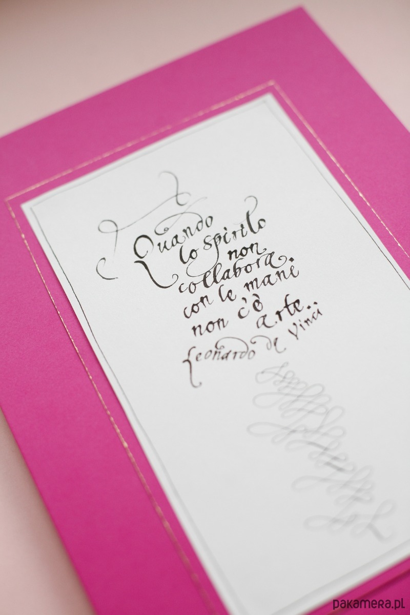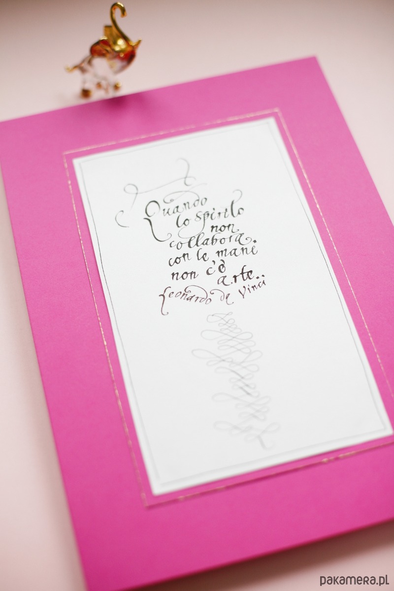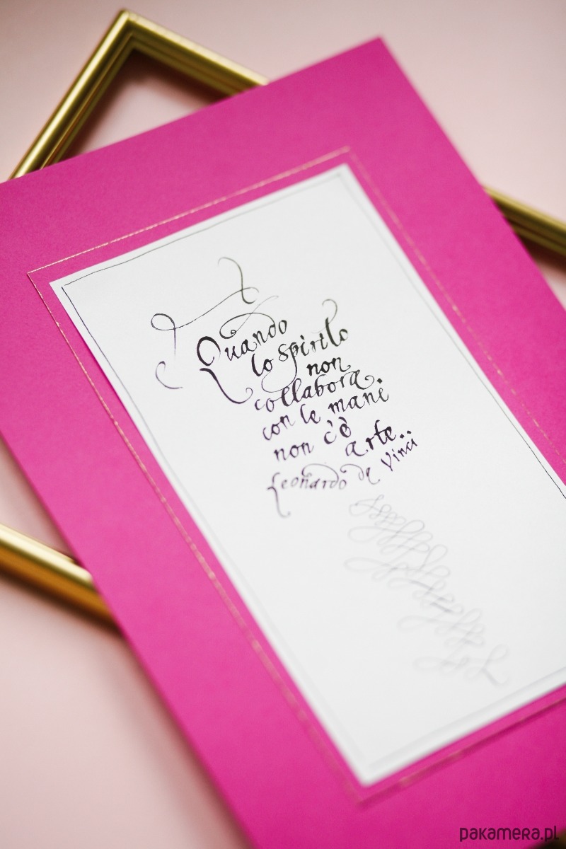 Cytat wykaligrafowałam ręcznie czarnym atramentem na włoskim papierze ekologicznym, podkleiłam różowym papierem, którego wewnętrzne krawędzie ozłociłam złotą farbą.